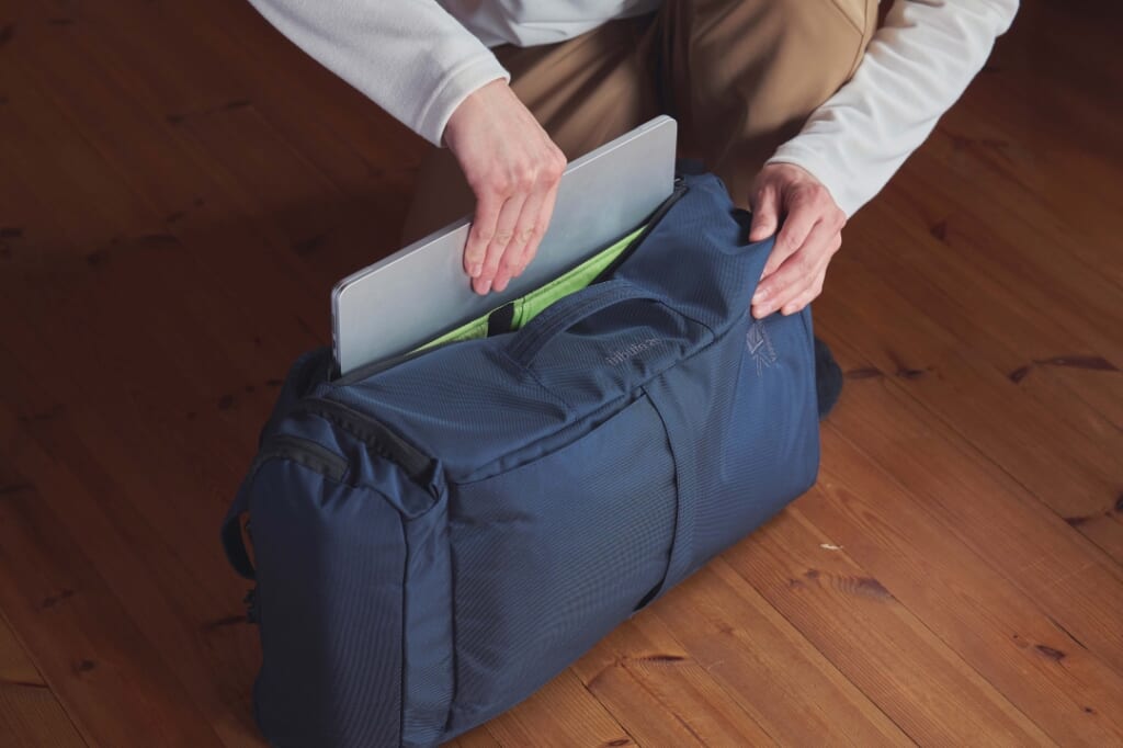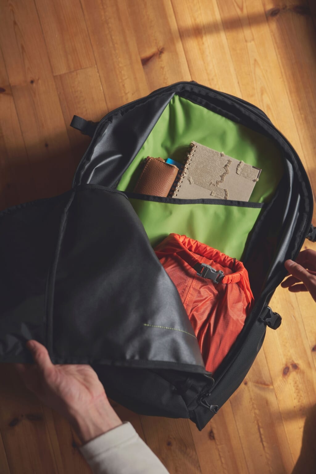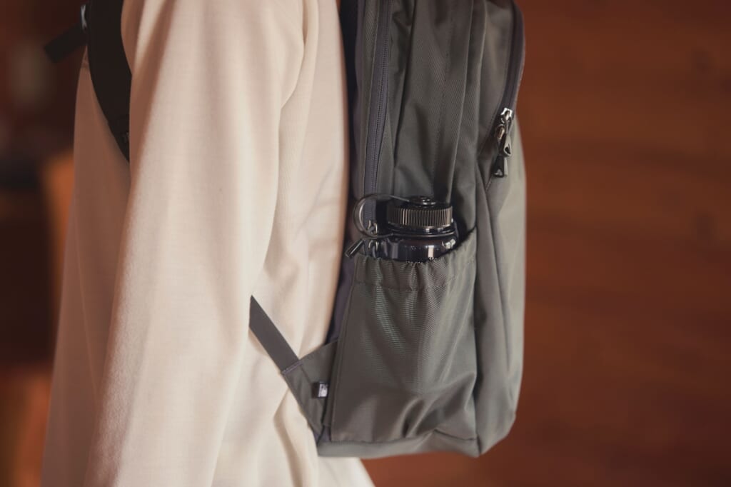 サイドには500ミリリットルのペットボトルが収まるポケット、反対側には内部にアクセスできる大きなサイドジッパーを備えている。サイドハンドルにより、カバンのように横持ちも可能だ。