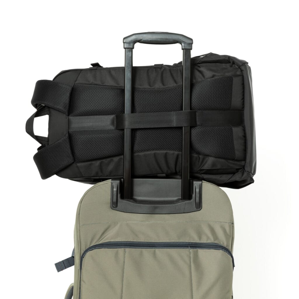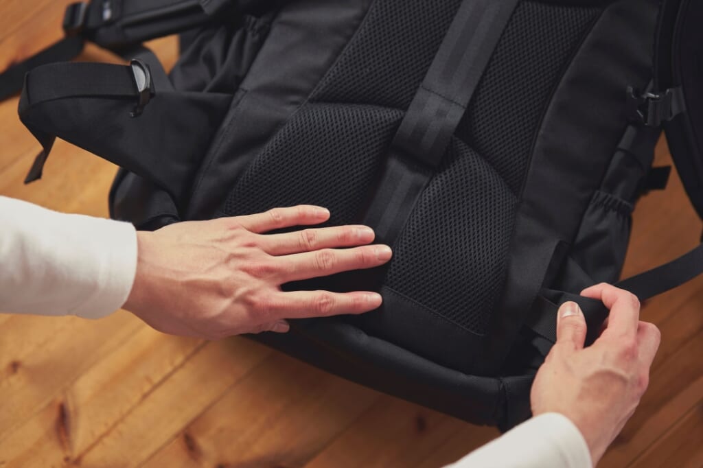 シリーズ共通の機能として、本体のボトム部分にパッドを内蔵しているので、バックパックを床に置いた際の衝撃を和らげてくれる。こちらもスーツケースに取り付け可能。
