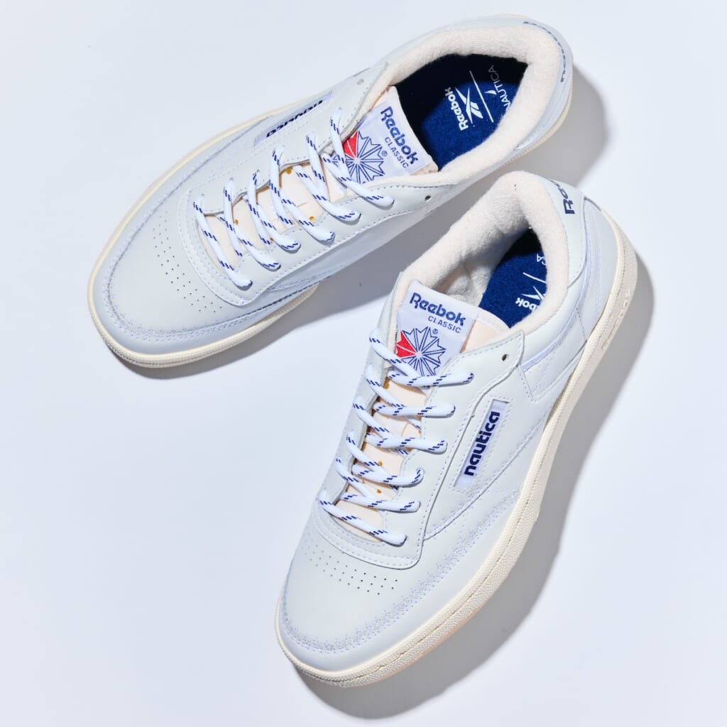 目玉といえるのが清潔感とクラシックさが魅力のシューズ“クラブシー”。テニス由来のシンプルデザインをクリーンなホワイトレザーで構築し、アウトソールはノーティカのロゴが透けて見えるハーフクリアに。サイドやヒールパッチなどにはリーボックのフォントによるオリジナルロゴを配した。
