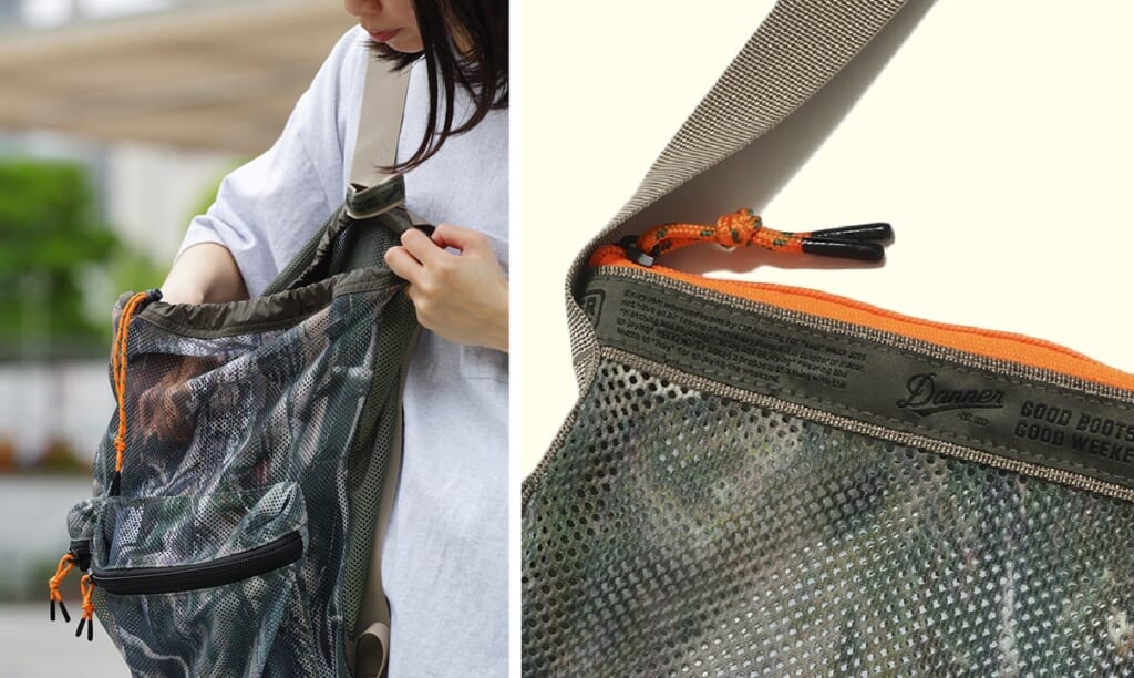 ダナーのメッシュバッグシリーズは、2WAYトート、ショルダー、リュックタイプの計 3種がスタンバイ。ブラックやグレーといった落ち着いたカラーのほかに、ショルダーとリュックにはリアルツリーカモ柄を設定。