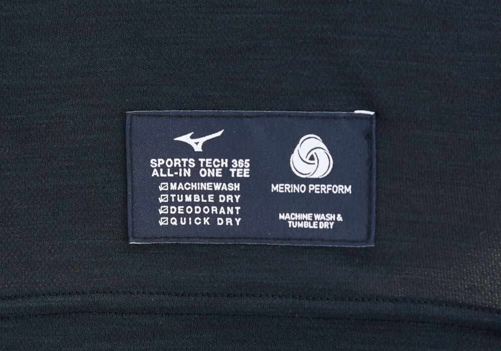 高機能天然繊維のメリノウールを50%使用し、肌に直接触れる裏面にはポリエステルメッシュでミズノ独自の二層構造を採用。吸汗性と速乾性を高め、汗をかいてもサラリとした着心地を保ってくれる。
