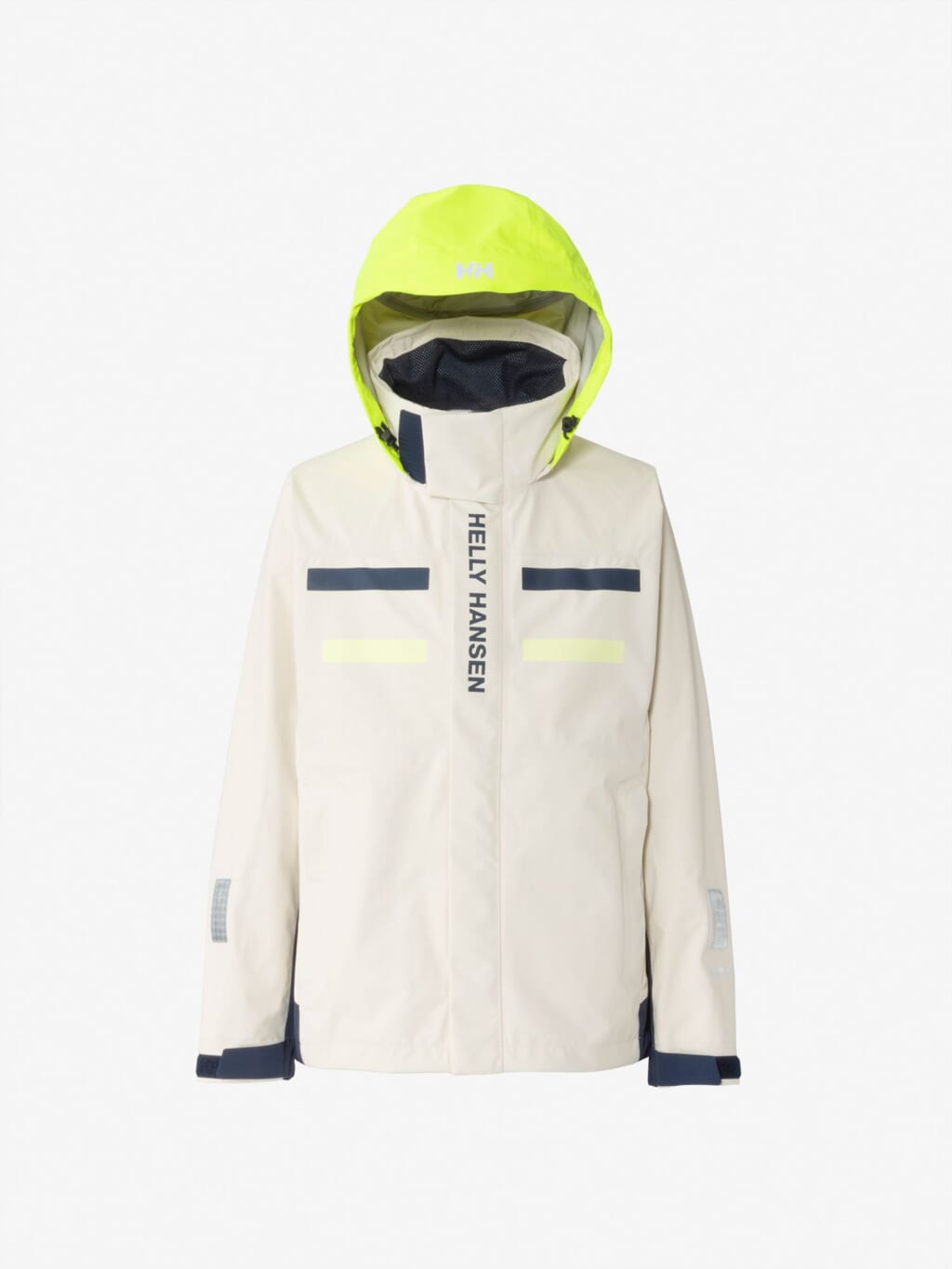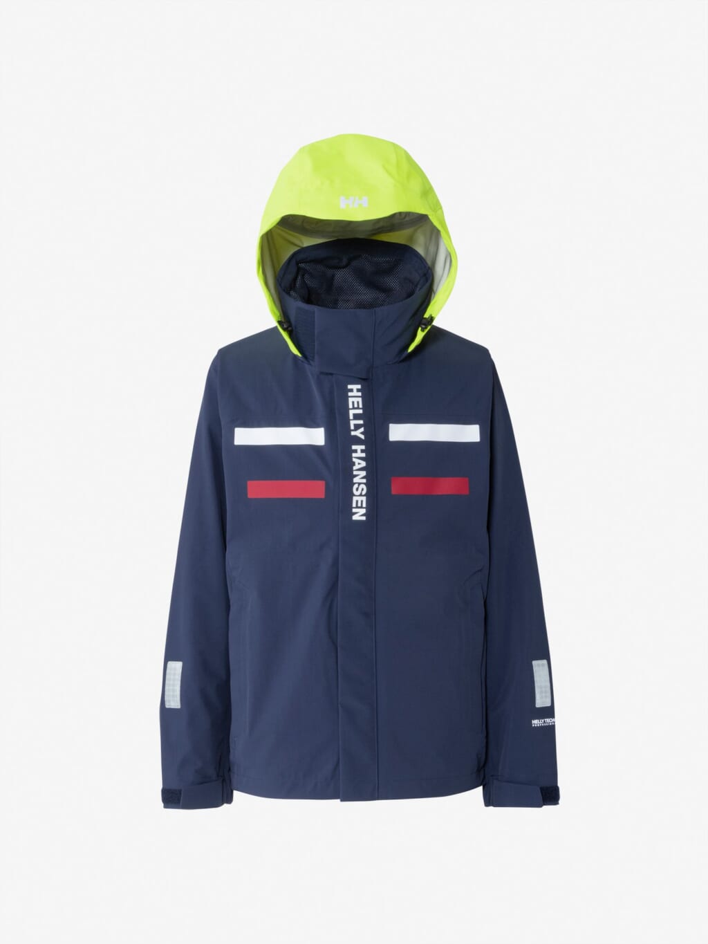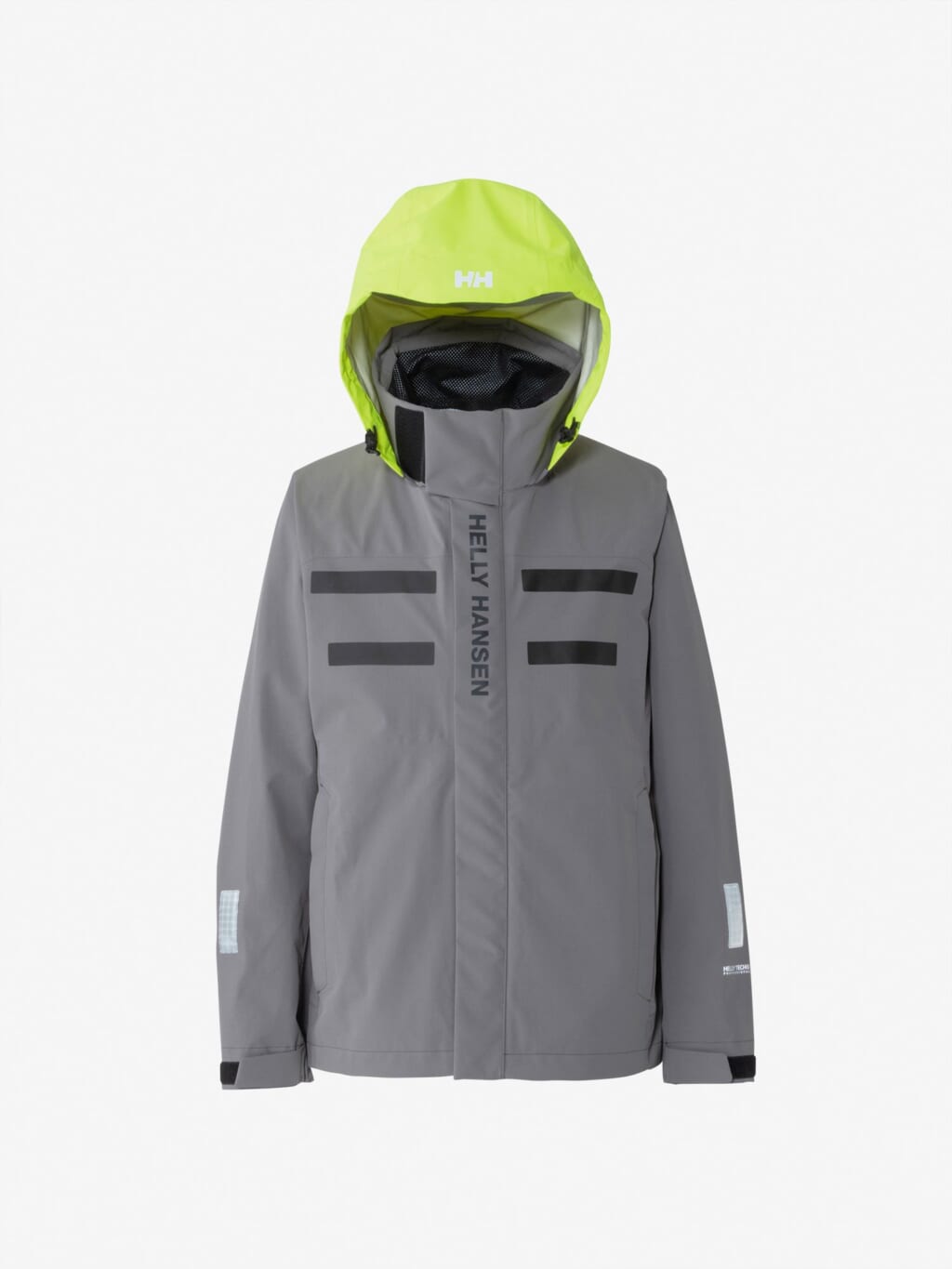 フードは、ビルトイン仕様で、バタつきが気になるときはすっきりと収められます。フードをフラッシュイエローの配色にし、SOLAS条約(海上人命安全条約)に準じたリフレクトサイトのワッペンをフロントに設けることで、海上での視認性を高めています。
