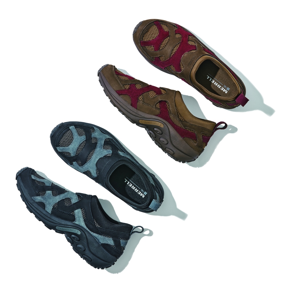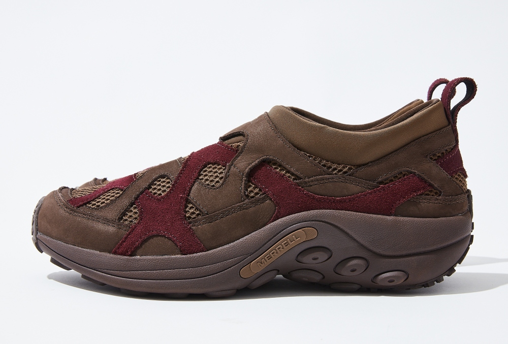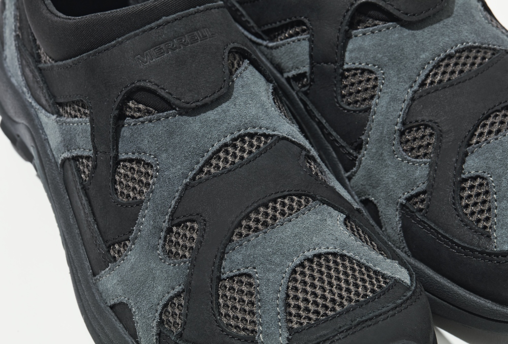 名作モデル、メレル マングローブのデザインからインスピレーションをうけた、斬新なアッパーデザインが印象的。通気性に優れたメッシュを覆うように張りめぐらされた、スエードとフルグレインレザーのコンビネーションが、独創性といままでにないフィット感を実現している。