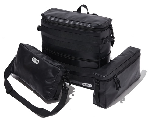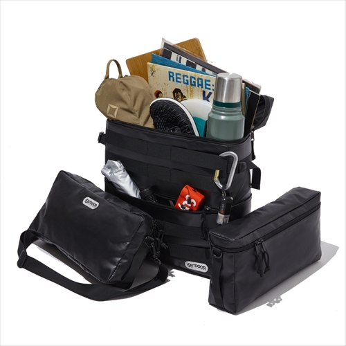 旅先やキャンプでサブバッグになる2つの横長ショルダーバッグが、デイジーチェーンで取り外しできる画期的デザイン。メインのバッグはレコードも入るスクエアな大容量タイプ。