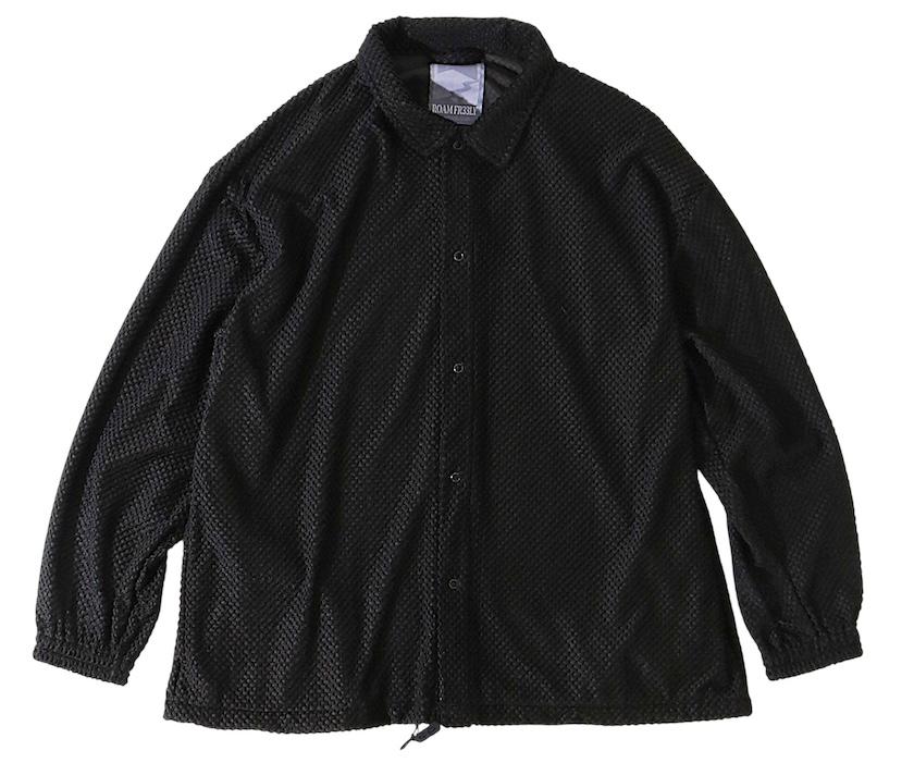 スタンダードなコーチジャケットがデザインソース。前立て部分の伸びを止めるために配置した、パステルカラーのネームテープがチラッと顔を覗かせるのが洒脱です。