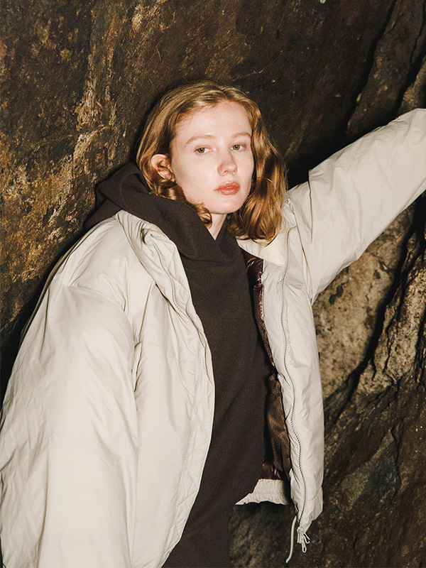 続いてはショート丈でスタイリッシュなウィメンズモデルをご紹介。袖はあえて長めの裄丈に設定され、手の甲まで隠れるボリューミーなシルエットが特徴。