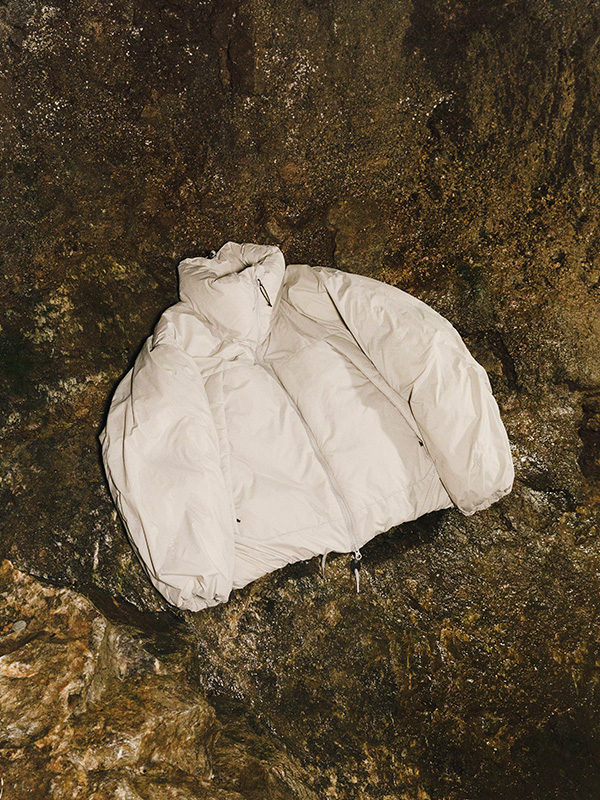 また、袖口やフード口はストレッチテープでバインディング処理されていて、冷気の侵入を防ぎながら顔まわりや袖元をすっきりと見せるディテールにも注目。裾はゴムスピンドル仕様なので、スタイルや気温に応じてシルエットを自在に調整可能です。