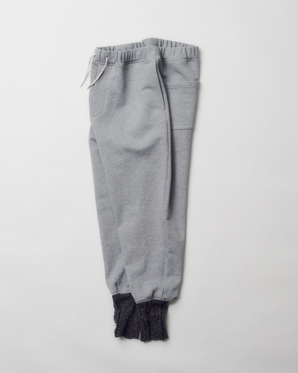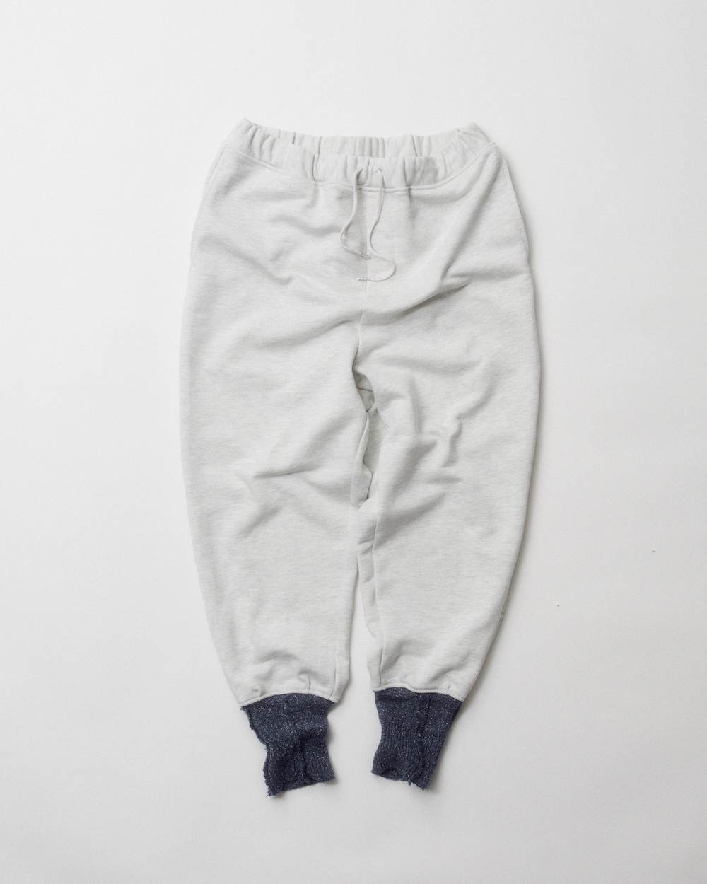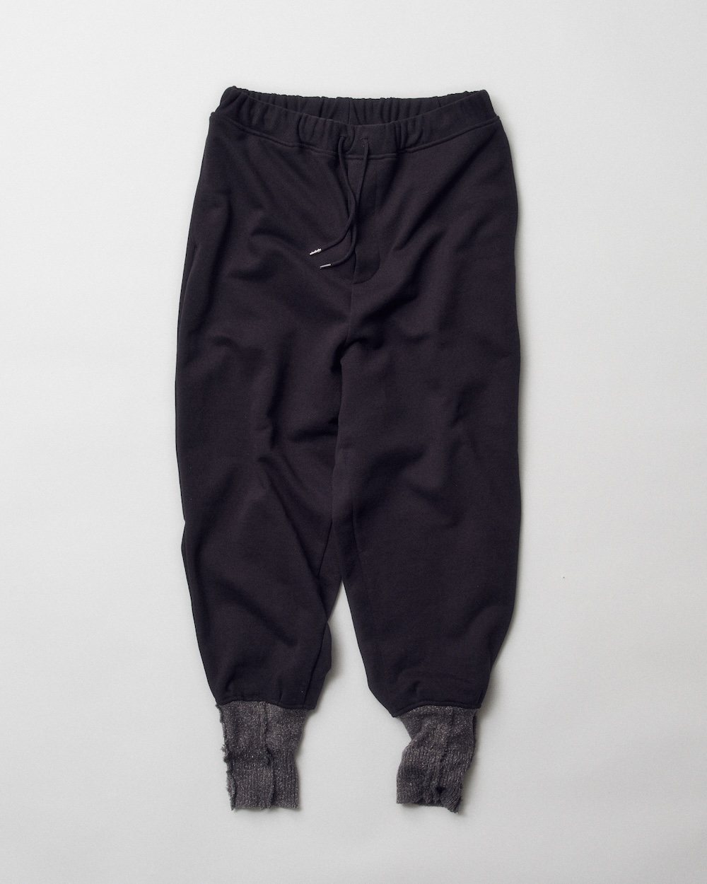 リブ付きのスウェットパンツはウエスト周りから、ゆとりあるシルエットで、ヒップから強めのテーパードに。また、裾には靴下風のリブをつけ、パンツの上から被せているような変化球的なデザインを採用しています。
