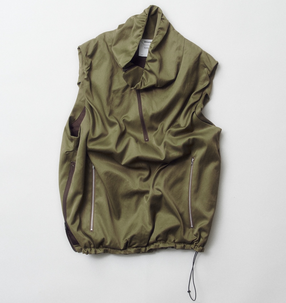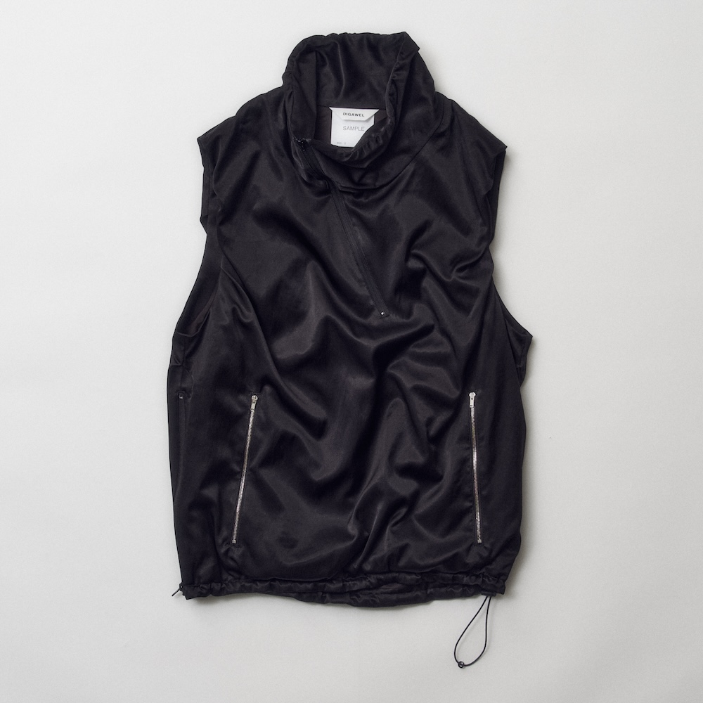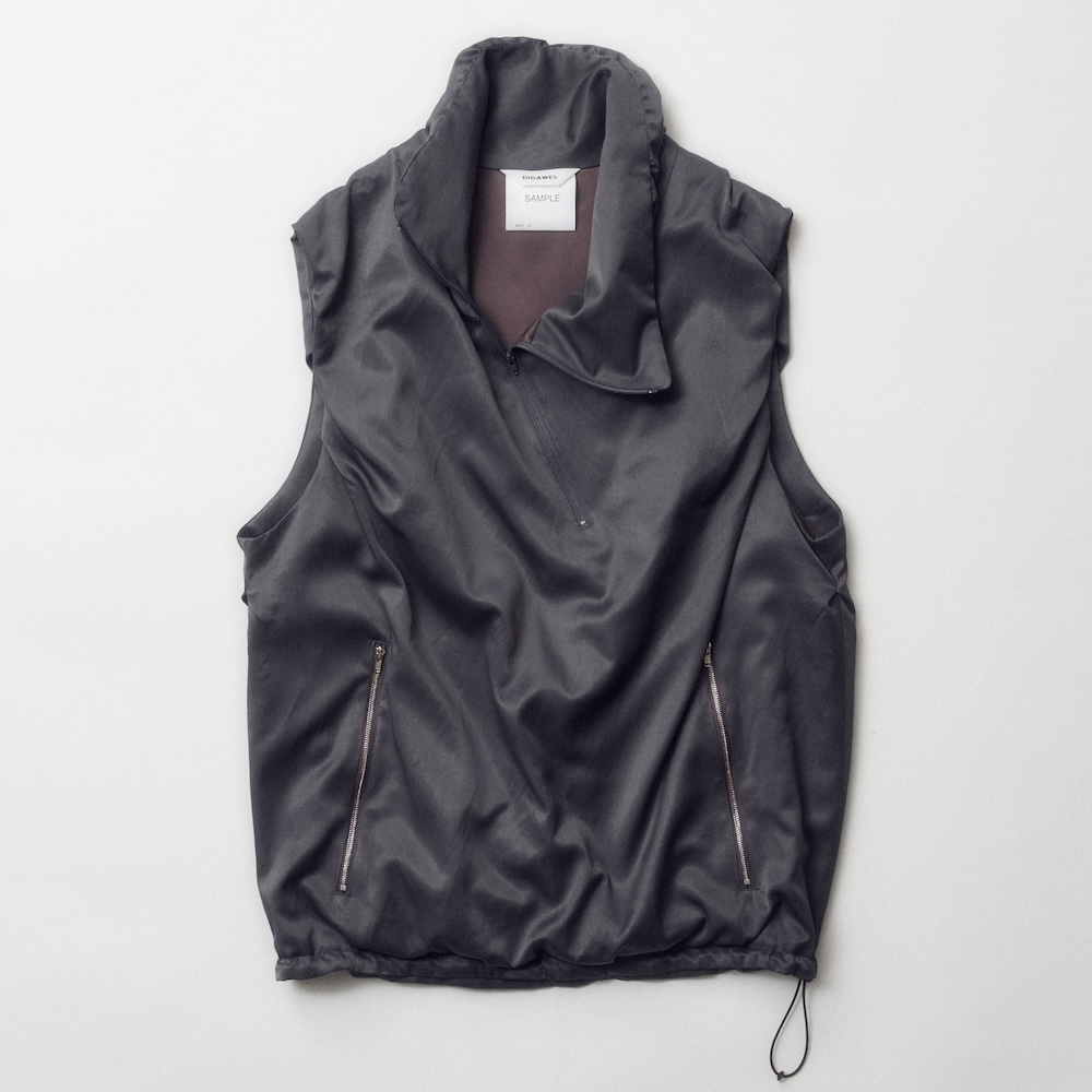 端正なドレープを加えたベストからご紹介。少し高めのネックに、斜めのハーフジップとサイドのジップポケットが特徴的な一着。薄い中綿を封入することで、柔らかなアウトラインを構築。右裾にはサイドジップ、左裾にはスピンドルが付属しているので、自在にシルエットの調整が可能に。