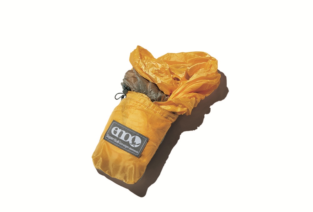 軽量性に優れたイーノのハンモック。こちらはムーンライトギアの別注カラー。「ゆとりのあるサイズだから、165cmのジブンが入ると完全に包まれるんですよ。おかげで蚊帳要らずです(笑)」。
