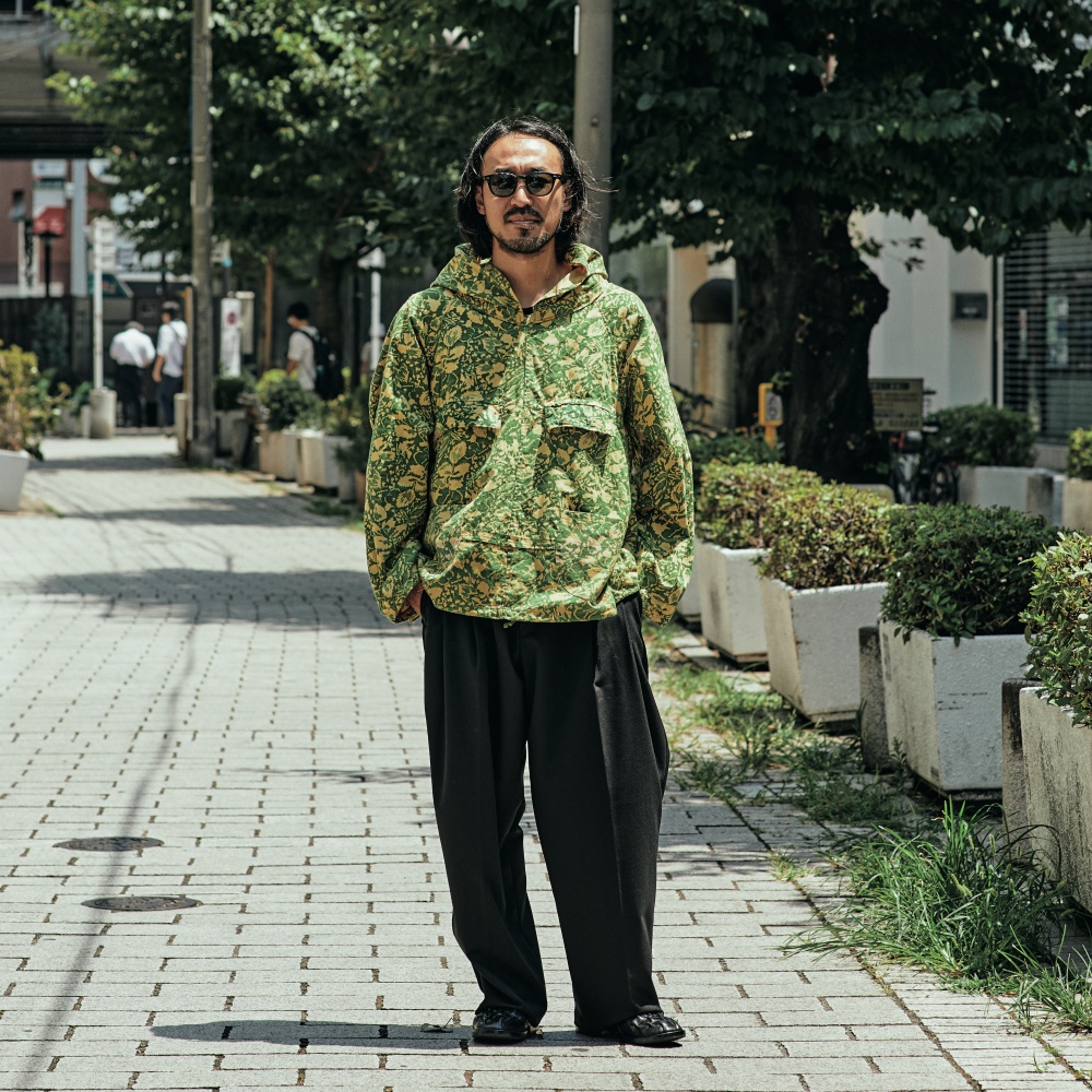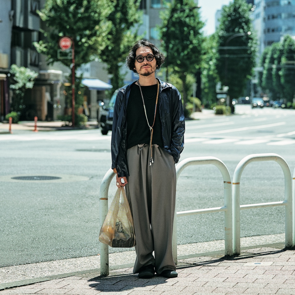 アパレルメーカーから独立して、エロティックをオープン。旅行が趣味で、買い付けの旅以外で海外に遊びに行くこともあるんだとか。「先日、プライベートで台湾に行ったけど、結局古着屋を巡ってしまいました(笑)」。古着以外に国産ブランドのアイテムも少し取扱い、こちらのパンツもそのひとつ。「上品なウール生地なので、古着と合わせてもラフに見えません」。ウールブレンドワイドストレート トラウザース¥44000/エッセイ スモッグパーカ/ルーマニアミリタリー シューズ/マルコスホーン