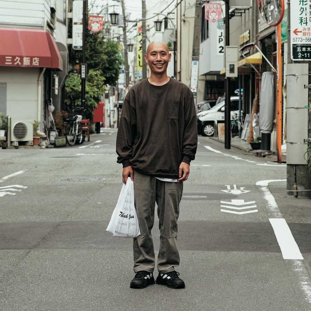 3年前にバイトリーダーから昇格した、スーパーマーケットの名物店長。つねに肩肘張らないリラックスした着こなしが基本。「今秋はひさしぶりに、細畝のコーデュロイパンツが履きたいキブンになっています」。早速、今秋に注目の細畝コーデュロイパンツを着用。「定番のロンTとも相性バツグン」。スウェットのような形のロンT ¥4950、コーデュロイイージーパンツ(価格未定)/ともにリラックスフィット てぬぐいの手さげ袋 ¥1980/スーパーマーケット シューズ:シーヤ¥16500/アディダス