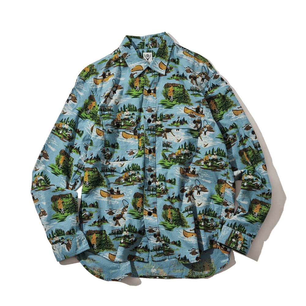 厚手で肌触りのよいフランネル生地を採用。フライフィッシングやハンティングシーンなどのアウトドアシーンのイラストを落とし込んだ総柄デザインをプリント。