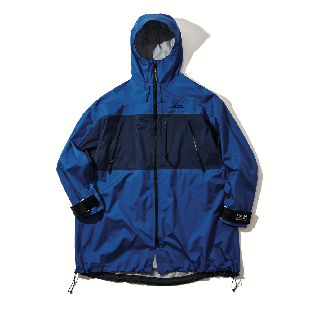 フロントからバック、袖下まで横断する切り替えが特徴。完全防水仕様の軽量3層素材を採用。袖口のレザーベルトカフは今季のアイコン的ディテール。