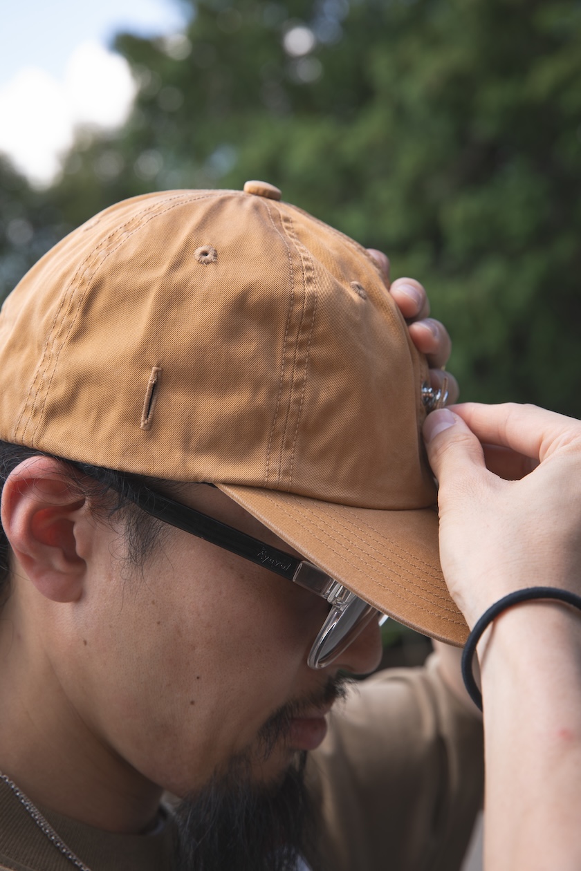サイドから後頭部にかけてのラインに緩やかな丸みを持たせ、長時間の着用でもストレスを軽減したフィット感に。高密度のコットンツイル生地は軽やかながらもコシがあり、型崩れしにくい耐久性を追求。ウォッシュ加工によって肌馴染みの良い風合いもプラスされています。