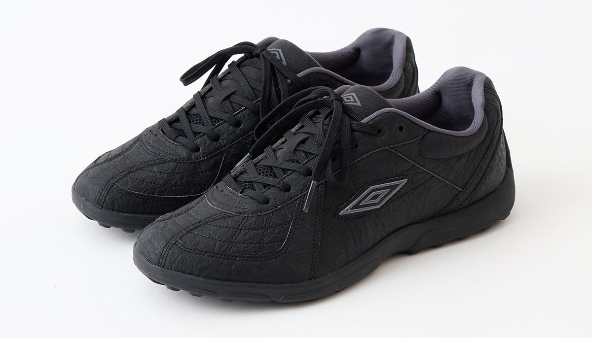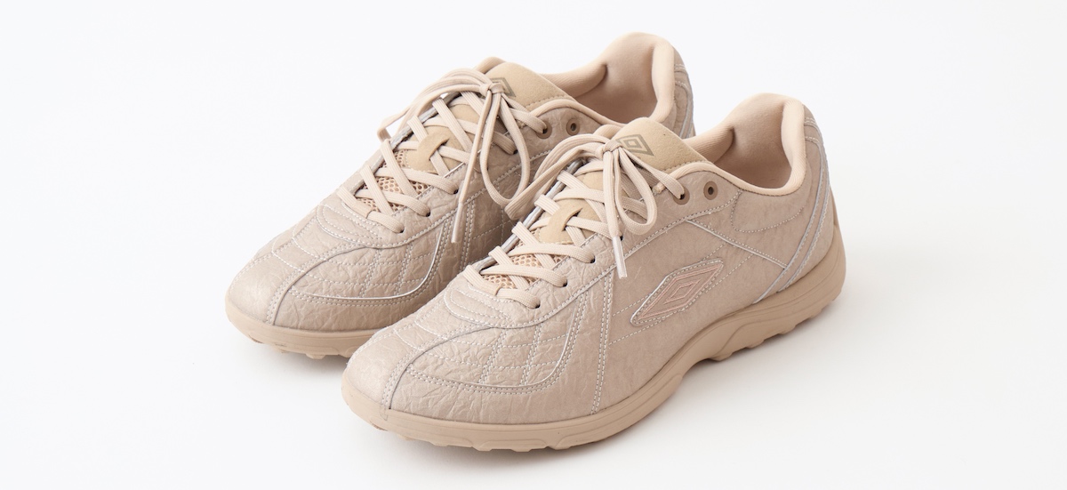 フットボールシューズを思わせる「アンブロ」らしいアウトソールと、凹凸あるヴィンテージライクな合成皮革アッパーが高級感を醸す。あえてシンボルマークをボディと同色かつミニサイズで落とし込み、スタイリッシュにまとめたのがお見事。