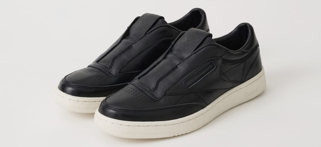 「リーボック」のレトロなテニスシューズ“Club C 85 VINTAGE”をシューレースのないスリップオンにアレンジした一足。足に馴染みやすいカウレザーを使用し、アッパーとヒールにWMロゴをレイアウト。