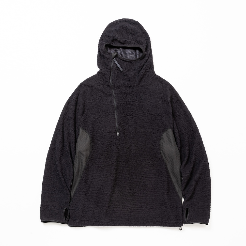 ゆったりとしたシルエットで、ベースレイヤーとしてもミドルレイヤーにも適応するフーディ。バラクラバと⼀体型になっているので、顔まわりの防寒性は完璧。ランニングやサイクリングなどのアクティビティにもオススメの一着です。