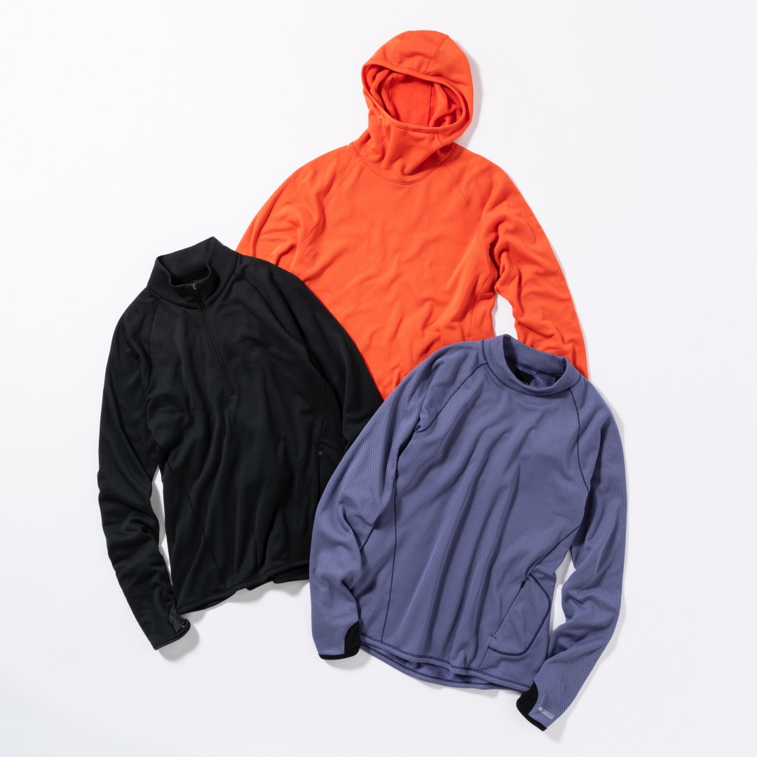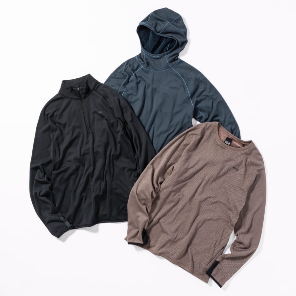 この“AIRMESH”シリーズは高い通気性と保温性を両立した温度調節ウェアとして、もとより山のユーザーたちから高い評価を得ていたが、従来よりも織り密度を高めることで、寒さに強くそして長く使える仕様にアップデートされた。