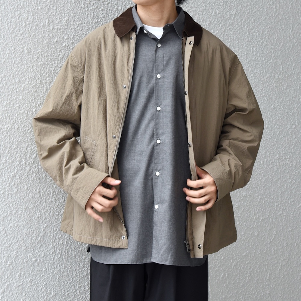 表地にはシャリ感とハリを出すタスランナイロン、衿部分にコーデュロイを組み合わせた都会派。身幅はたっぷりで、丈はやや短めの設定なので、太めのボトムスと相性バツグン。裾にはスピンドルコードを搭載し、着丈やシルエットの調整が可能で幅広いスタイリングに対応可能です。