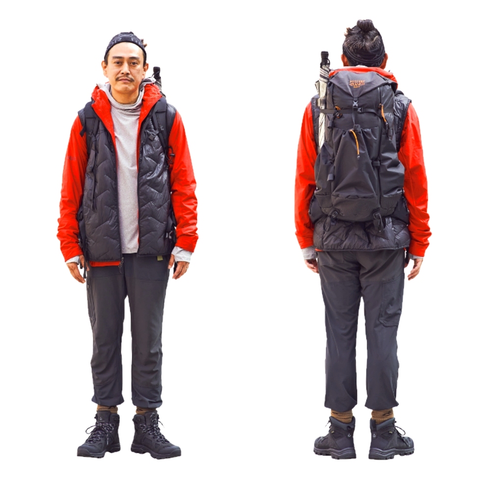 アウトドアリサーチを中心に、定番アウトドアブランドのアイテムを取り入れた永井さんのハイクコーデ。通気性に優れたフーディと中綿入りベストをレイヤリングすることで、温度調整も容易に。
