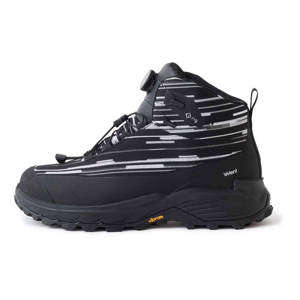 高機能透湿防水素材であるeVentを採用した完全防水仕様で、どんな天候にも難なく対応してくれます。また、着地時の衝撃が直に伝わるヒール部分は衝撃吸収に優れ、前へ蹴り出すつま先側の足底部分は安定感をしっかり確保しています。