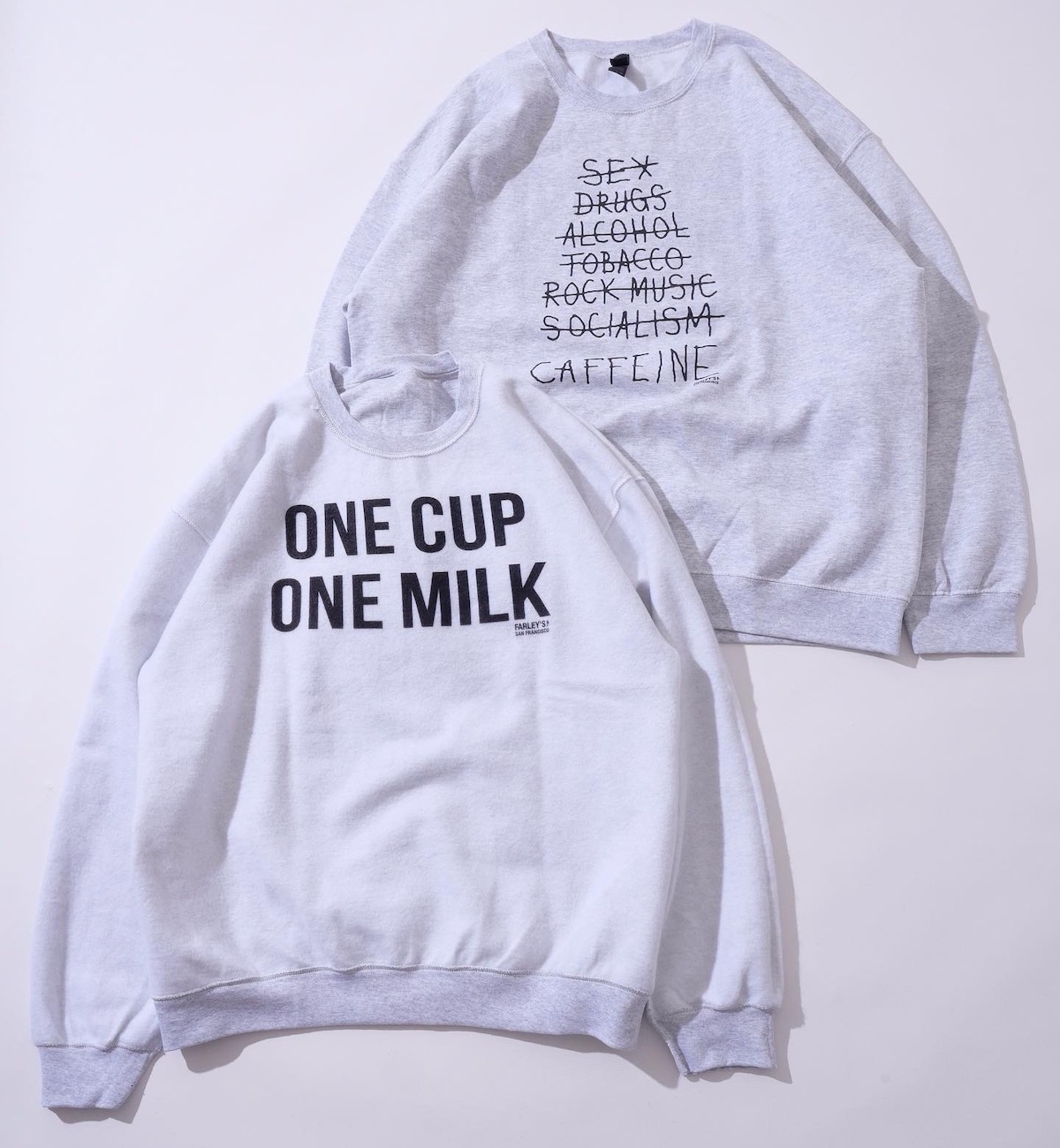 サンフランシスコ・ポトレロヒルの名物カフェ『ファリーズ』の代名詞といえるメッセージ“CAFFEINE ONLY”を表にプリント。裏の起毛面にはボディカラーによって異なるグラフィックが。ユーズドでも人気の高い裏面プリントは着込むほど馴染み、風合いに奥行きが出てくるのが魅力だ。
