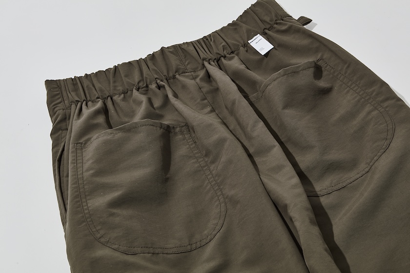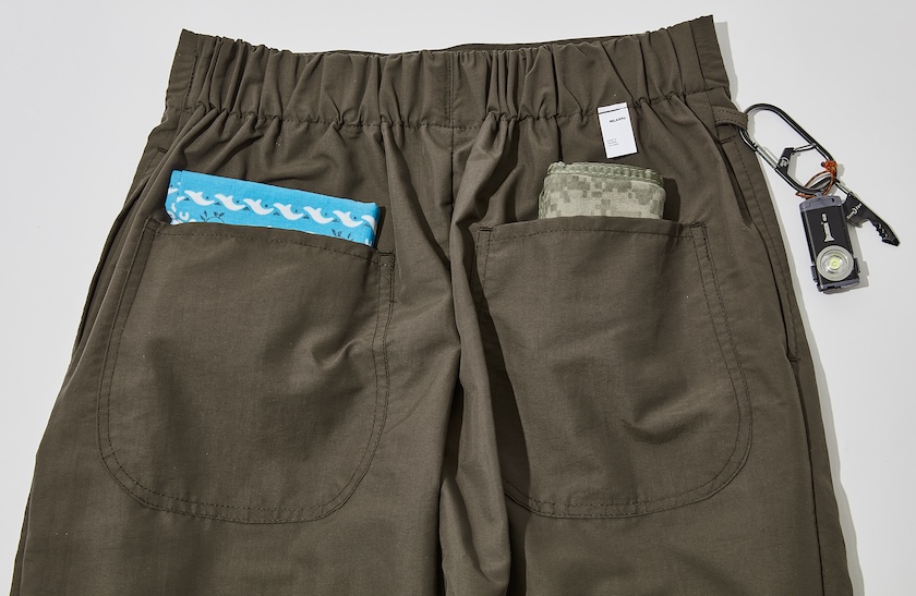 右サイドにはカラビナなどが引っ掛けられるループが施され、バックポケットはワークウエアのように大容量のポケットをレイアウト。ちょっとした外出なら手ぶらフリーで行動でき、キャンプでは小型のギアが持ち運べるフィールド仕様のディテールが散りばめられています。