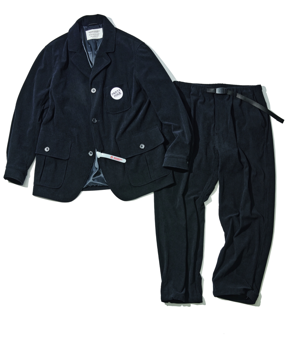 軽量でほどよい光沢が特徴のトリコットコーデュロイを採用。ジャケットは英国トラッドの象徴的アイテムがモチーフ。パンツはワイドフィットなクライミング仕様。