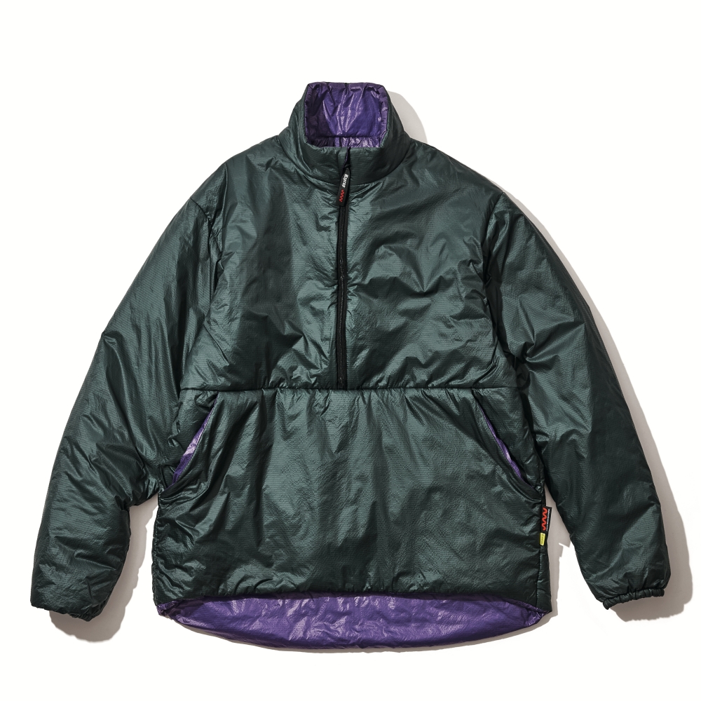 優れた耐久性と熱効率を誇るクライマシールドを使用したインサレーションスモックは、JMW「カンガルーアノラック」をベースに、パターンをリップラップが用意したもの。山行のレスト時にも街使いにも活躍する。