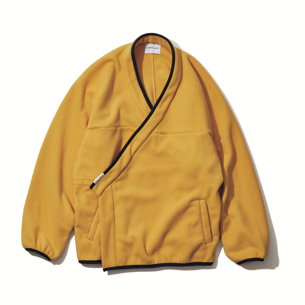 柔道着と作務衣のデザインを大胆に融合させたフリースジャケット。両サイドを留めるスタンダードな着方以外に、内側だけを留めアシンメトリーに、前で留めてカーディガンのように着るなど、着こなしも自在。