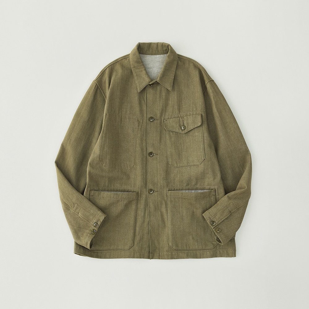1950年代のイギリス軍に支給されていたカバーオールをリソースとして作られたジャケットは、随所に施されたミリタリーフラップや、負荷のかかる部分に配された力布などのディテールが加えられています。綿の柄が入っているような粗野なムードのある生地を用いているので、ヴィンテージのような風合いにも注目です。