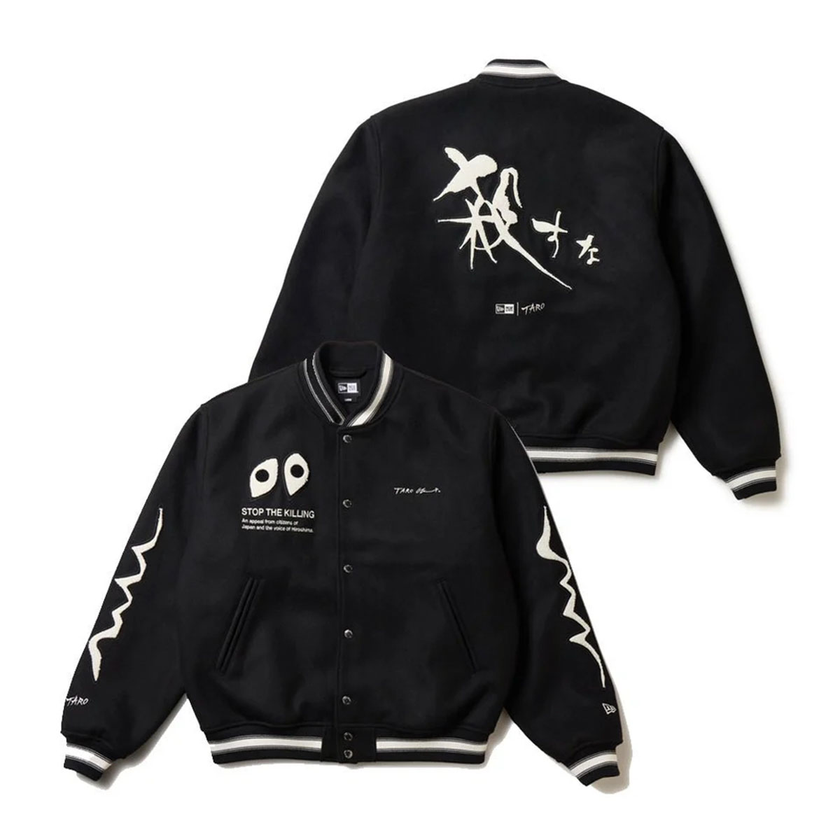 岡本氏のエッセンスをサガラ刺繍で落とし込んだ中綿入りスタジャン。アメリカンクラシックなショート丈とゆとりある身幅&アームホールが目を引く。背中には反戦メッセージとして知られる“殺すな”の文字が。