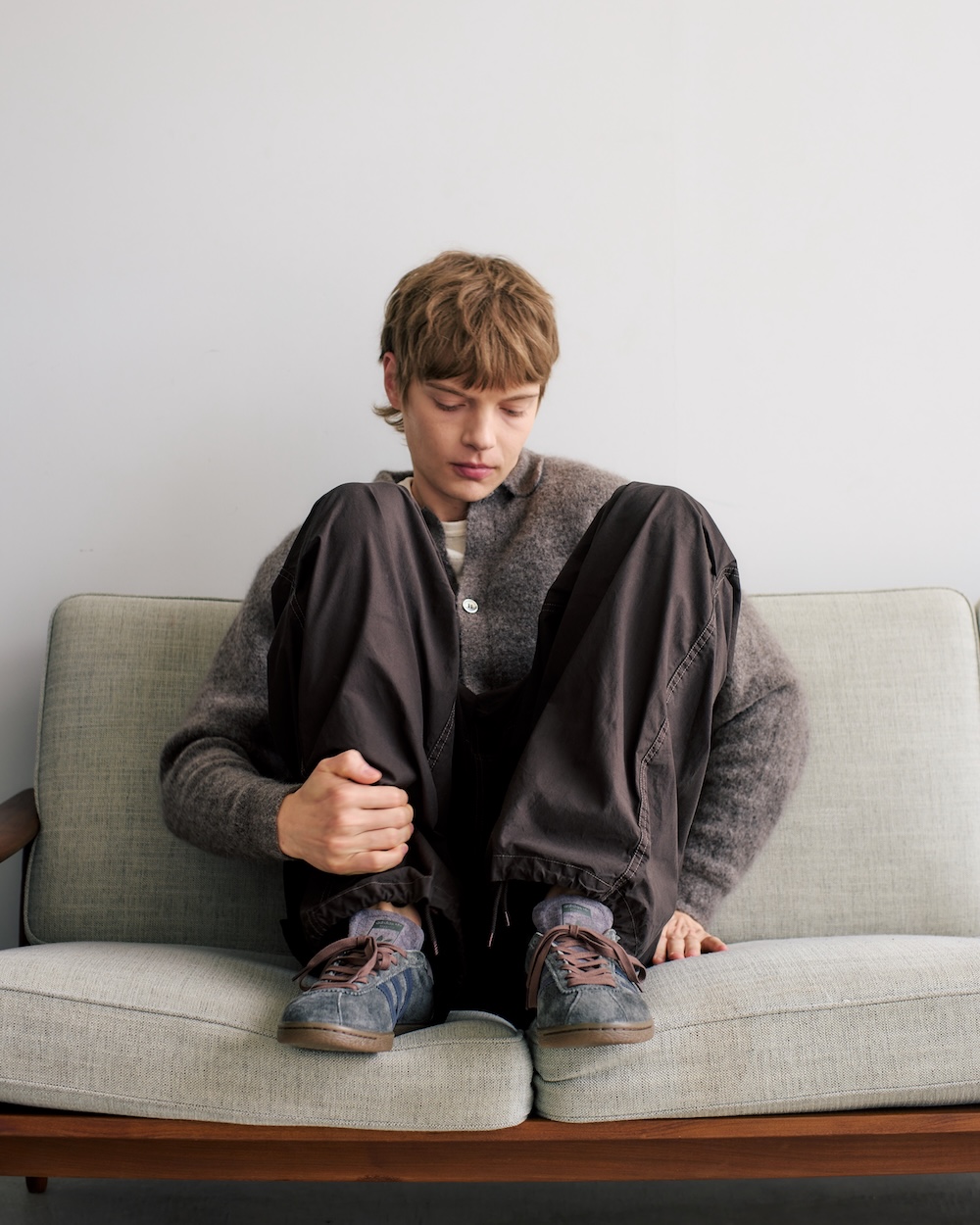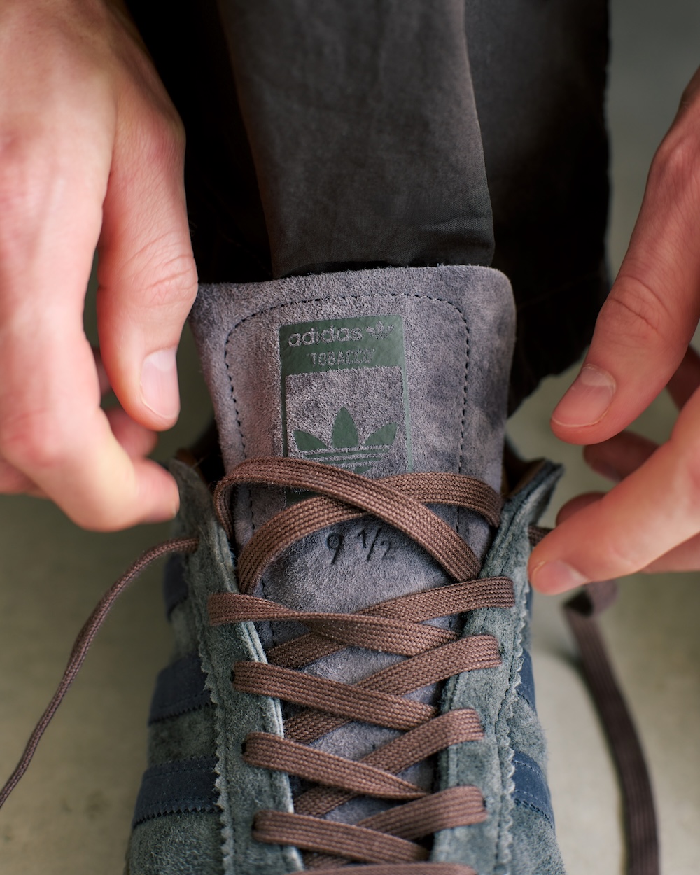アッパーにはオリーブとグレーを混ぜた絶妙なカラーリングのスエードを採用し、シュータンとバックステイの配色を変えることで素材の奥行きを演出。サイドのスリーストライプスには、ネイビーのベルベット生地を組み合わせて、コントラストを出しています。
