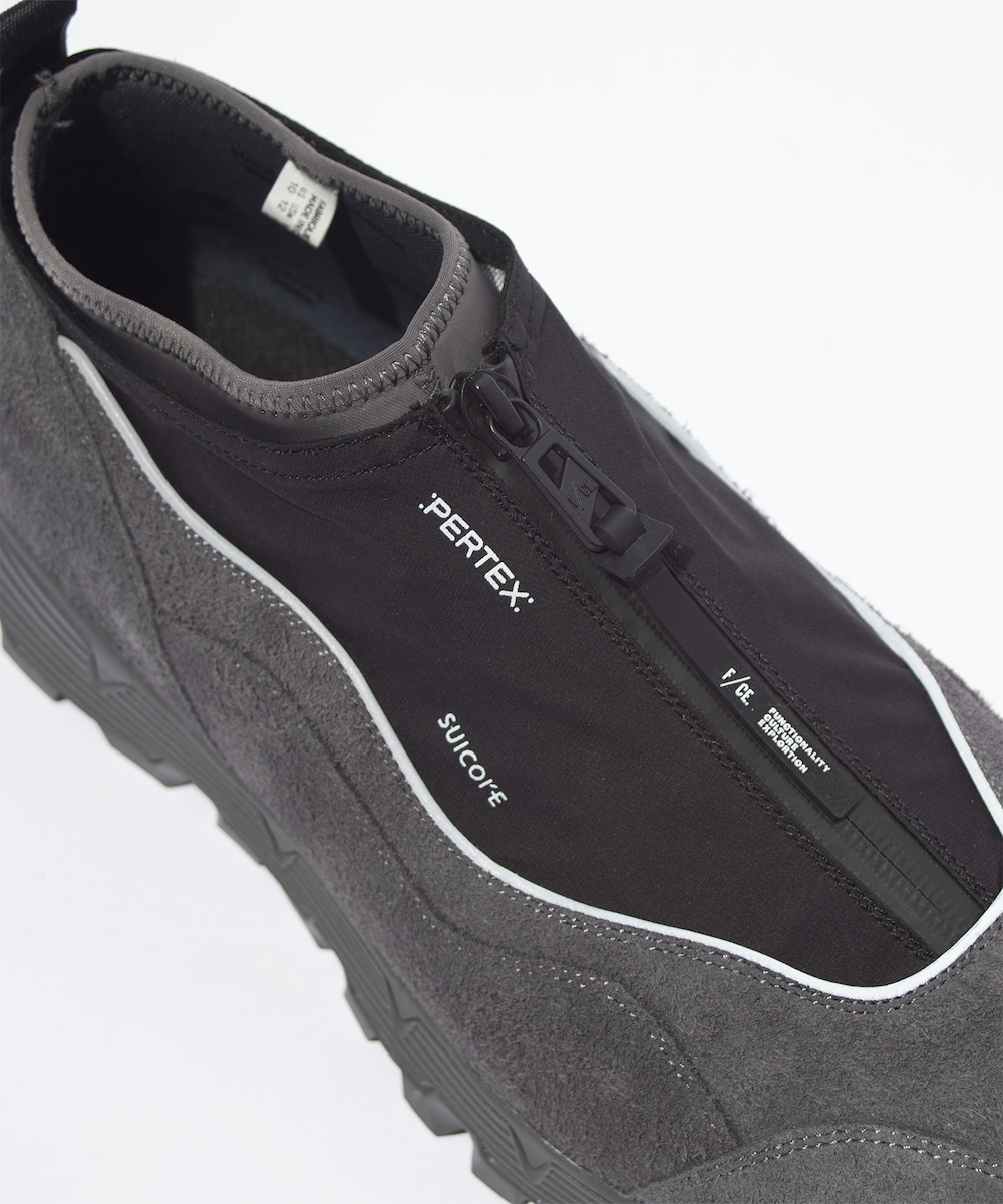 「スイコック」の定番モデルの“AKK-ZIP”を根源に、「エフシーイー」のアパレルで使用されている防水性と透湿性を両立させたPERTEX® SHIELDとスウェードのコンビネーションをアッパーに採用しています。そのちょっとした違和感も、この2ブランドならでは。
