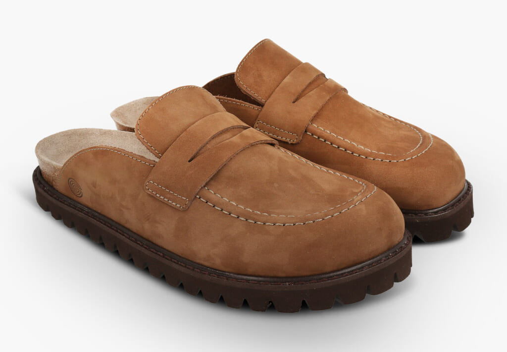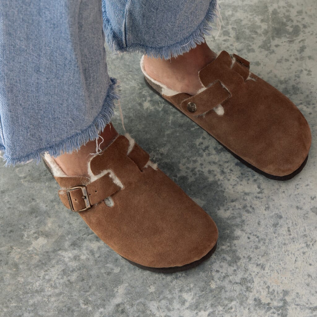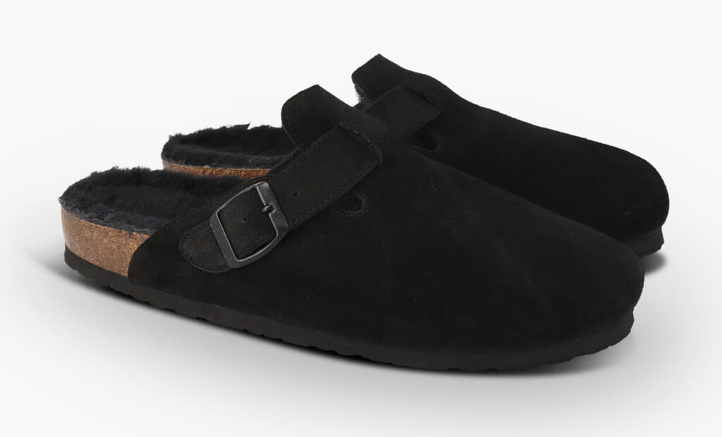 最後はクロッグタイプでプレーンなシルエットの“RIVA(リバ)”。アッパー部に本革スエードを用い、内側とフットベッドにウールボアを配してホカホカに! この天然羊毛はカラー(マンドルラorブラック)に応じて異なる色を採用しているのもポイントだ。