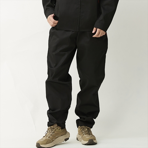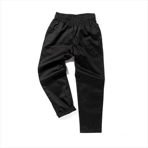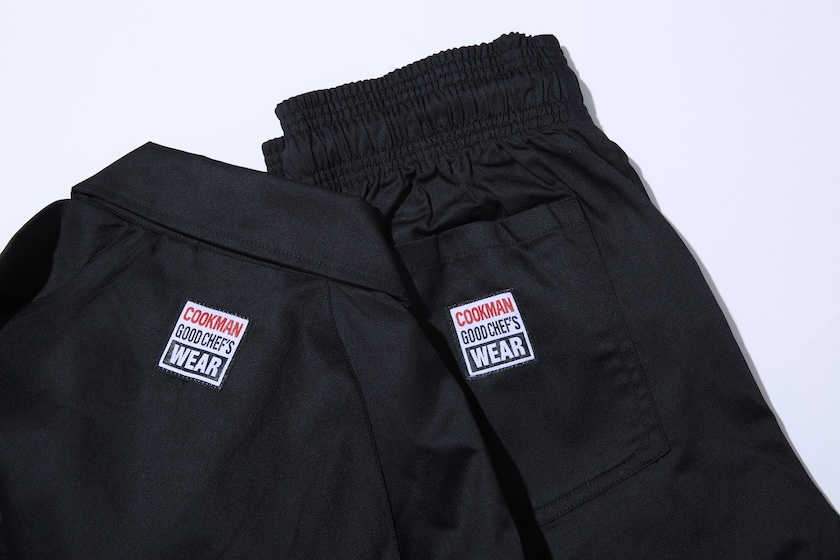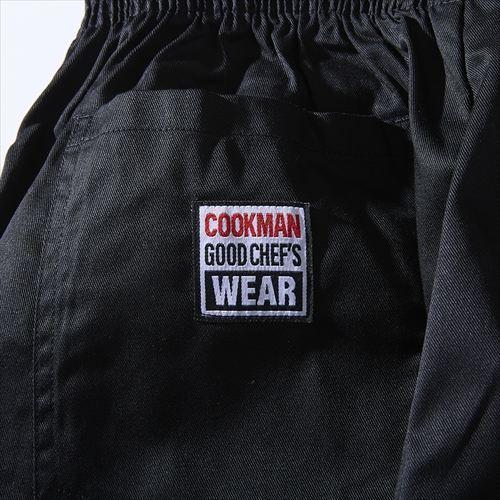 幅広ゴムをあしらったウエストでリラックスして穿けるシェフパンツ。クックマンのアイコン的モデルの別注バージョンは、オールブラックの男心をくすぐるカラーリングに。