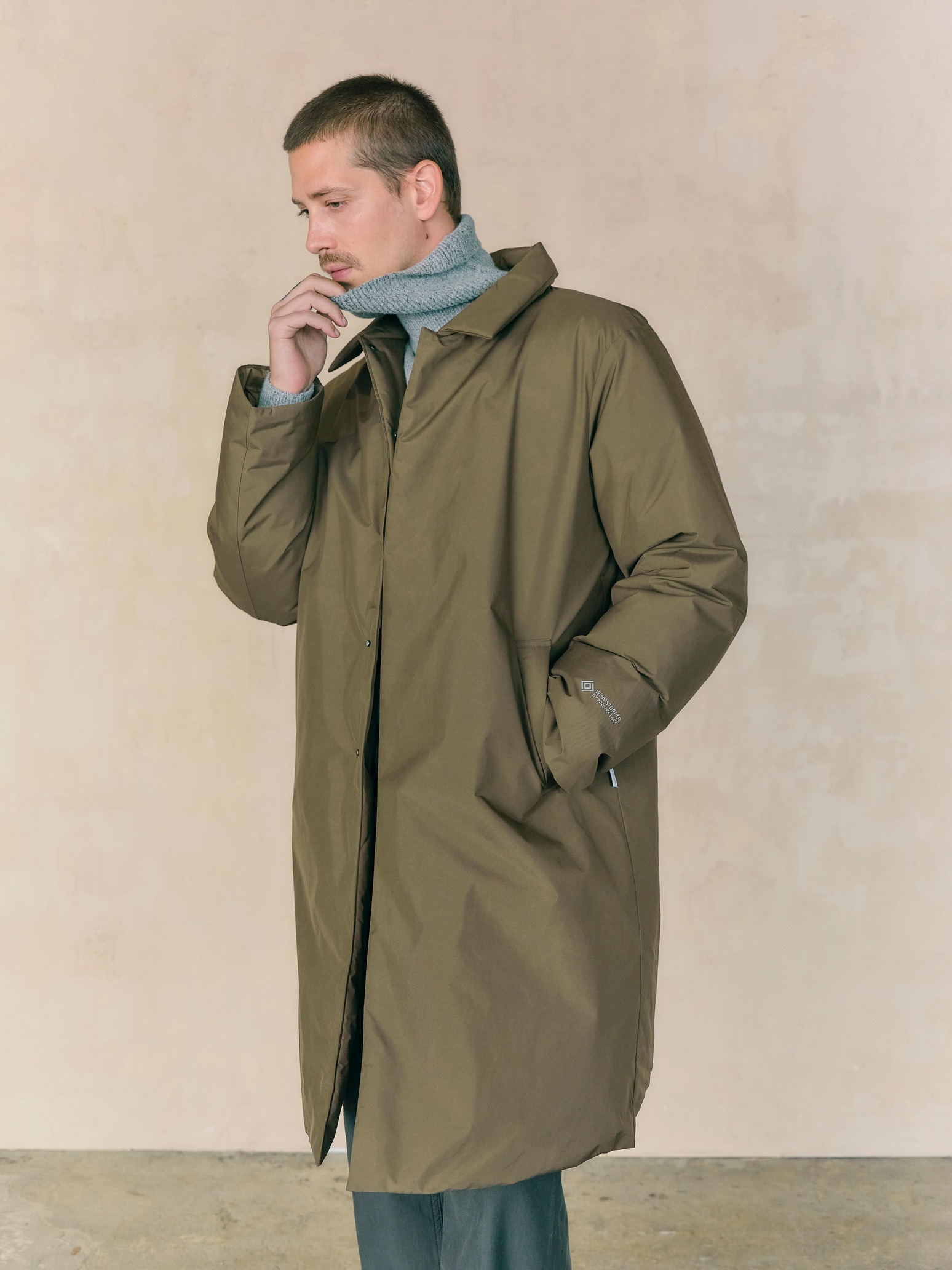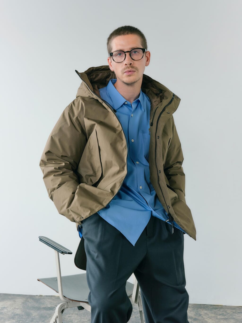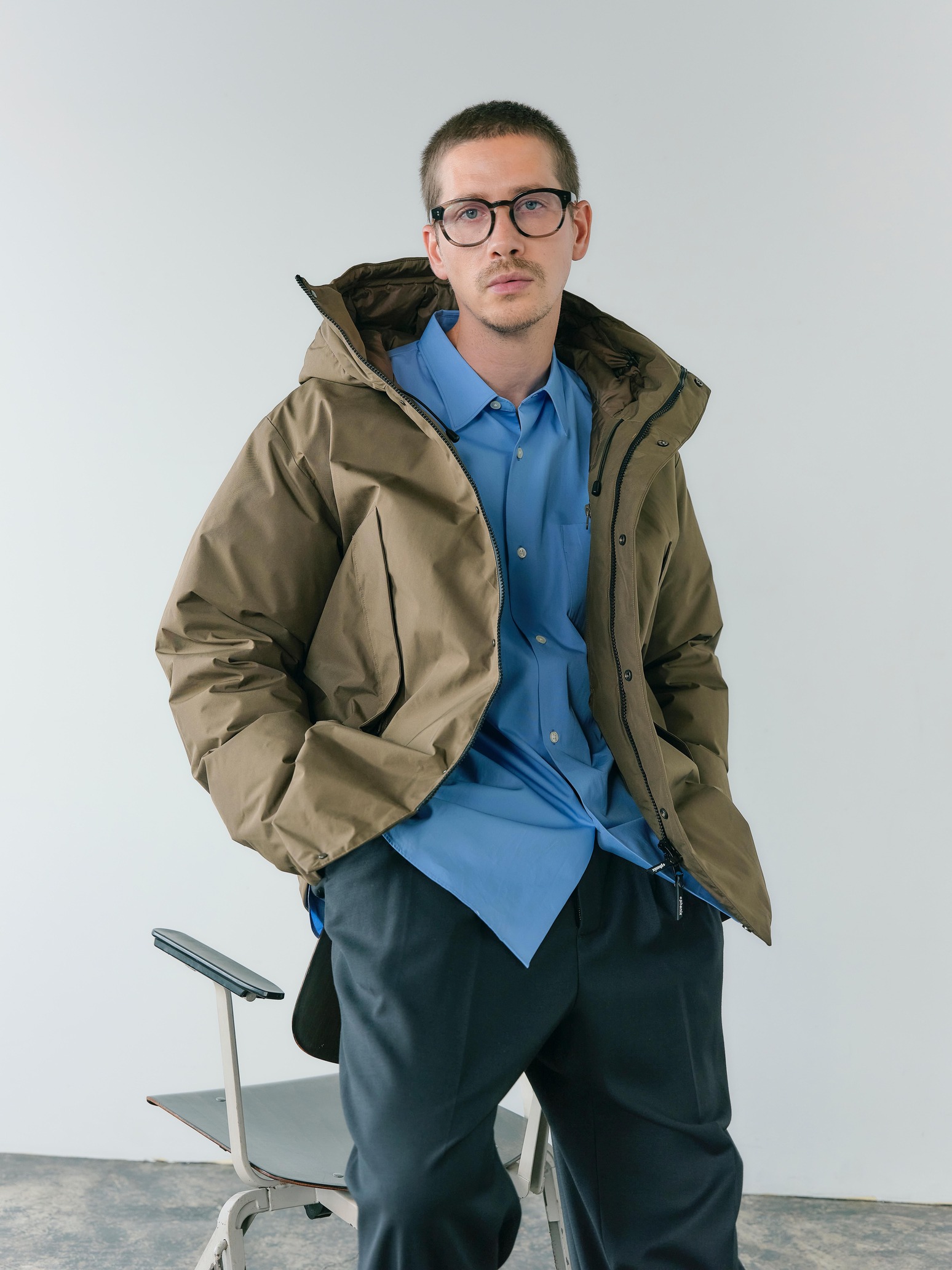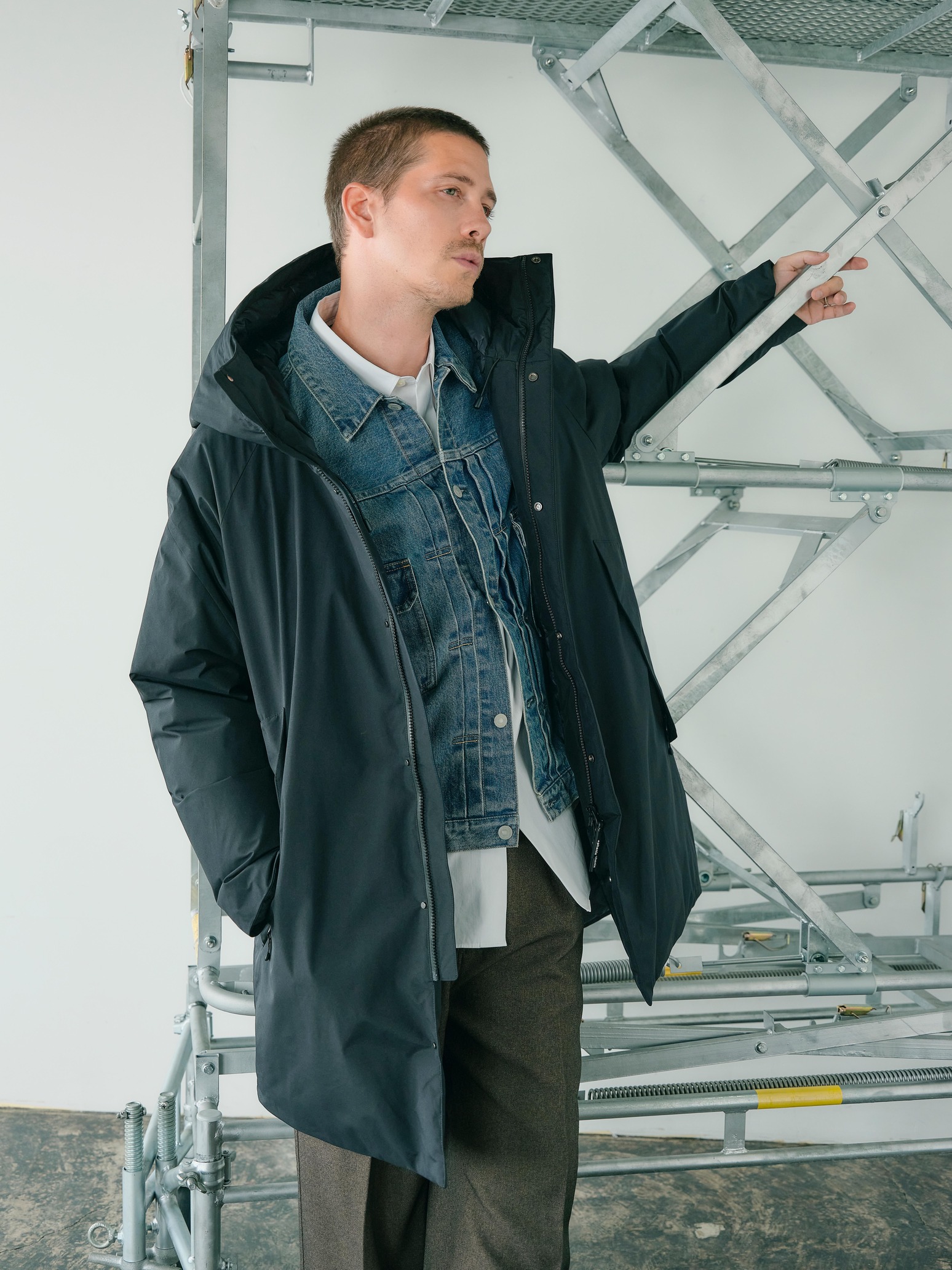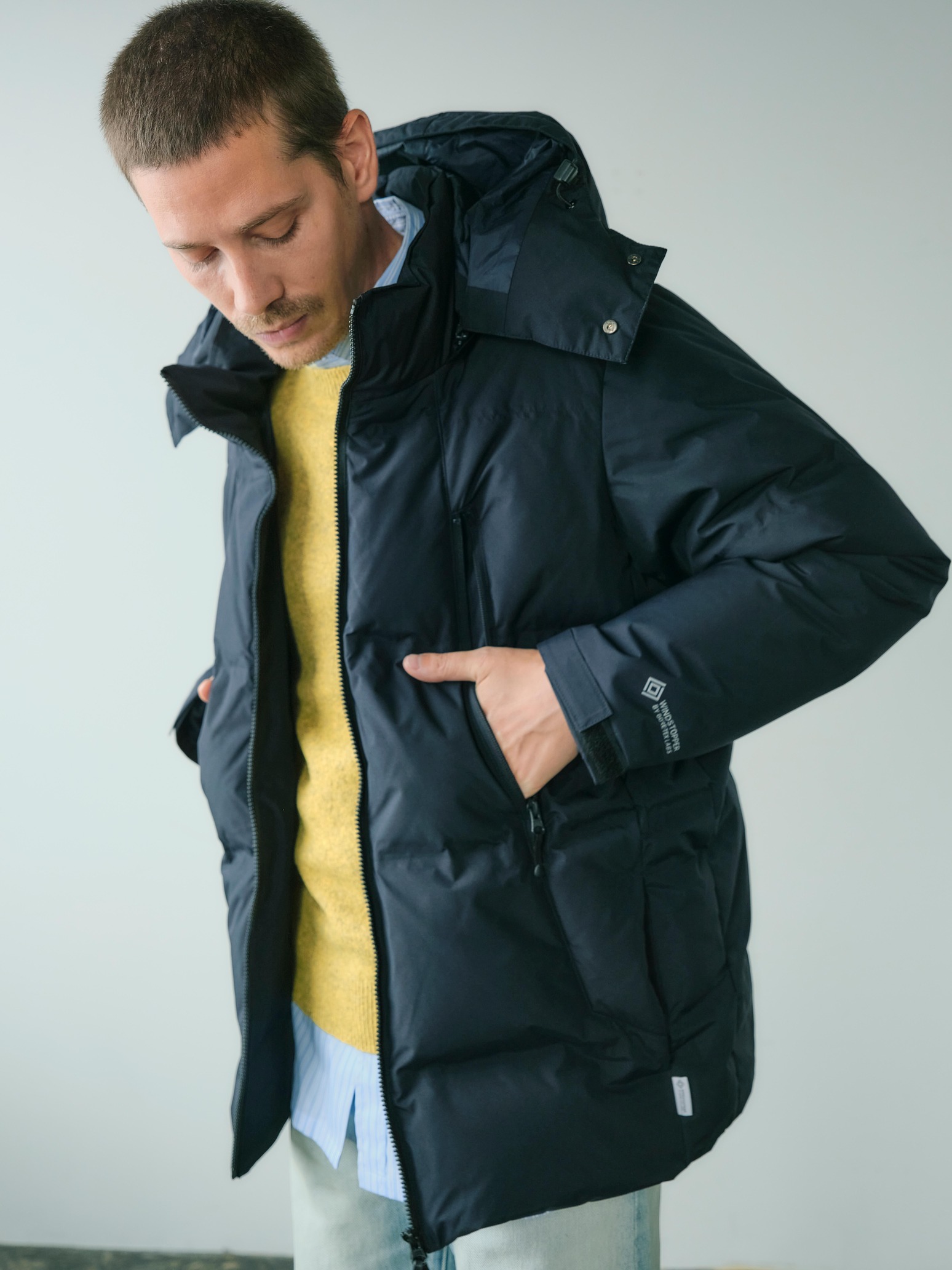 ミドル丈が特徴のダウンコートは極力ディテールを排除し、シンプル且つスタイリッシュでミニマルな大人の雰囲気に。スーツの上からも着用ができビジネスシーンでも使える保温性抜群の本格派だ。