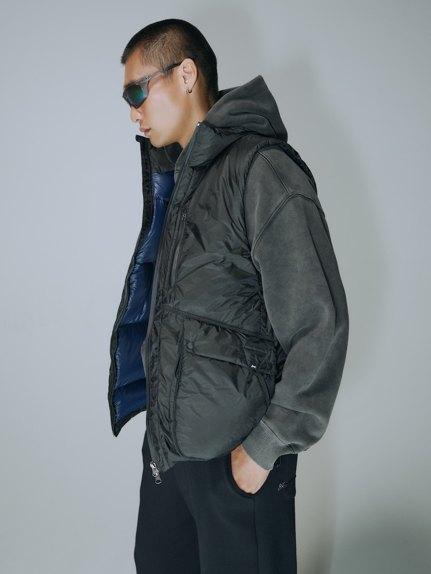 アウターの上からでも着用でき、天候を選ばずに快適な着心地をキープ。もちろん、シャツやニットとも合わせられ、軽快に着こなすことができます。