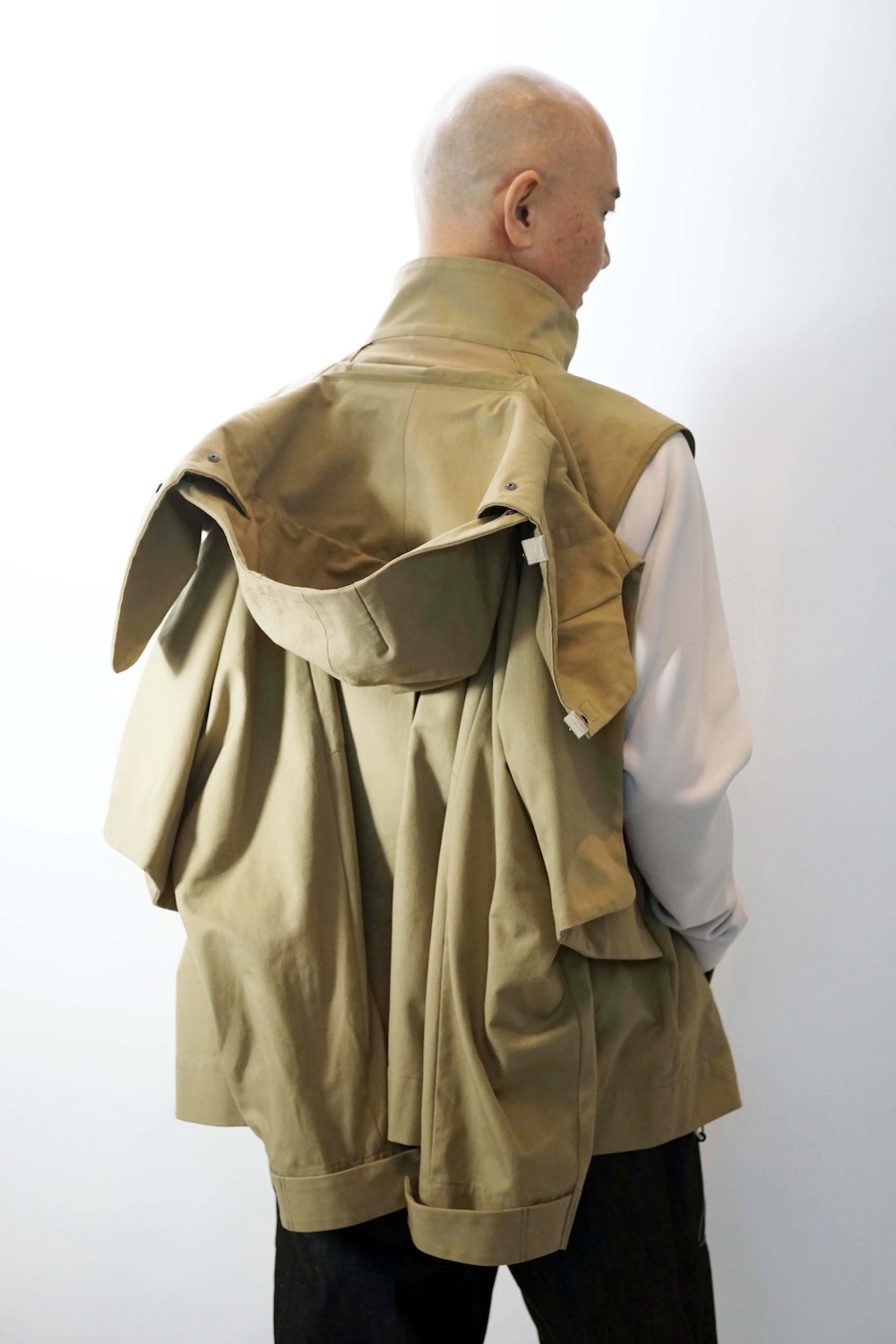 ジャケットの袖を抜き、パラシュートスタイルも楽しめる本作。CORDURA®ナイロンを使用しているので、言わずもがな耐久性はバツグン。トレンチコートが短くなったようなデザインで、ゆったりとしたAラインシルエットが特徴的です。