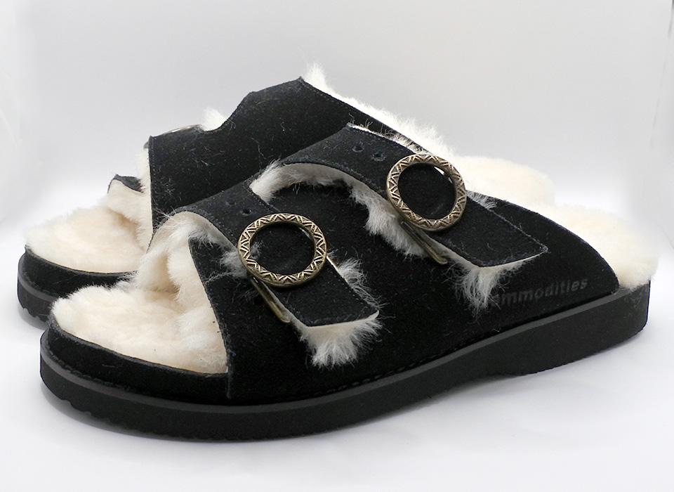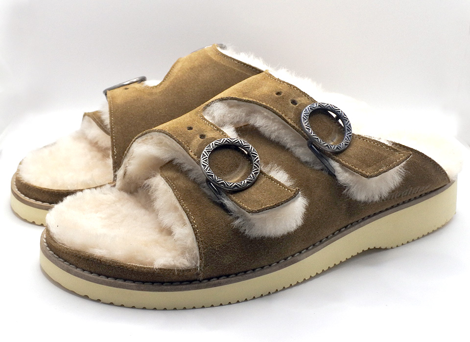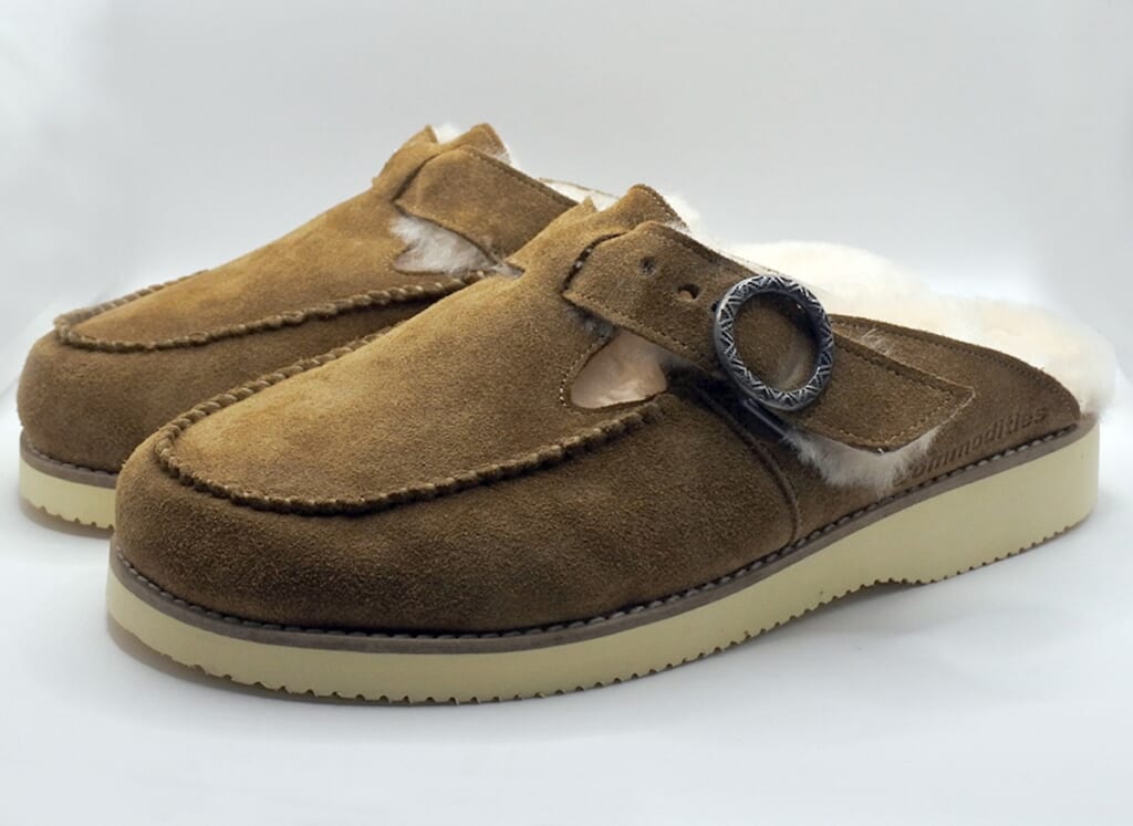 ライニングとインソールにフワフワのムートンを使用したサボ。オリジナルのバックルは、伝統的な建築物の装飾で橋や神社で見られる“擬宝珠(ぎぼし)”という飾りが着想源となっています。アウトソールにはグリップ力に優れたVibram社のクレープを使用しています。