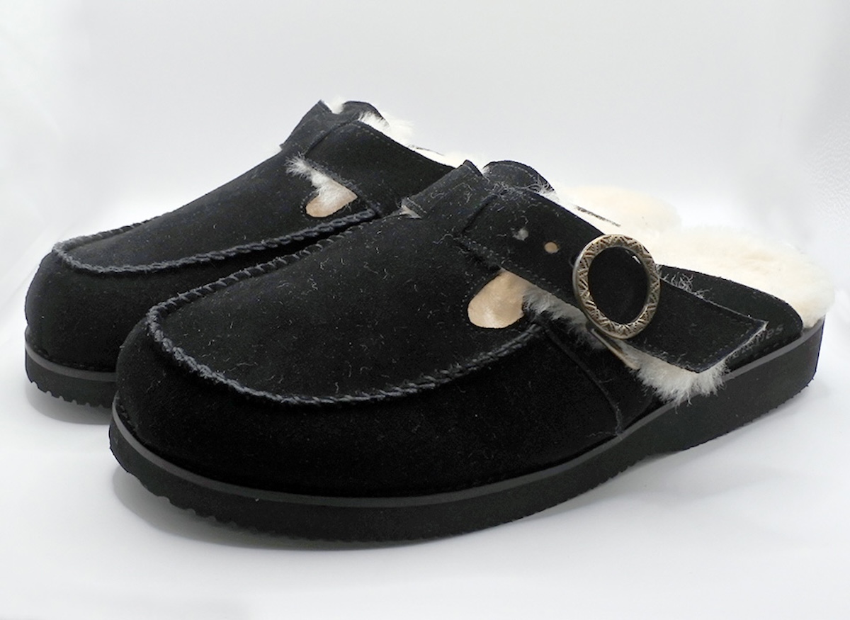 ライニングとインソールにフワフワのムートンを使用したサボ。オリジナルのバックルは、伝統的な建築物の装飾で橋や神社で見られる“擬宝珠(ぎぼし)”という飾りが着想源となっています。アウトソールにはグリップ力に優れたVibram社のクレープを使用しています。