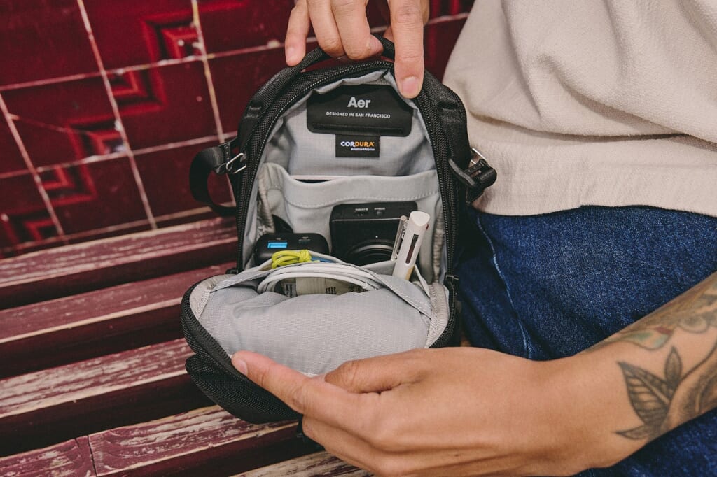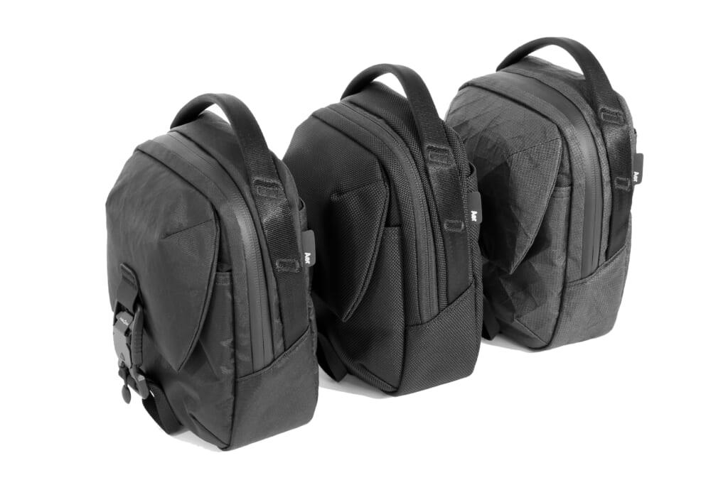 外観こそ黒系に統一しているが、中身は素材ごとに切り替えているのも見どころ。「Aer」のストリートスリングは一つあれば何かと重宝すること間違いなし!