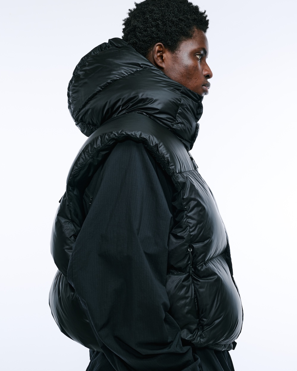重ね着を想定し、大胆に設計されたアームホールが特徴的なダウンベスト。多くの空気を含み復元性に優れたグースダウンを採用し、体温の半分以上が逃げるとされる頭部と肩まわりを効果的にカバーしてくれます。