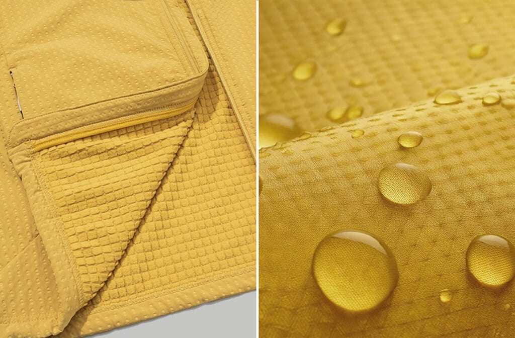 生地には、ブランド独自のHitoFleece(ヒトフリース)生地を採用(※Hitoは「道標」や「転換点」を表すスペイン語)。フリースの欠点でもある耐風性と耐摩耗性に優れた高密度織の表地に撥水加工を施し、さらに独自のグリッド加工により保温性とストレッチ性を高めたソフトな裏地を組み合わせた生地になっている。