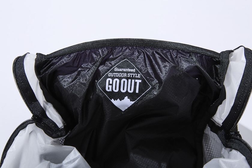 バッグ口を開けると顔を出すGO OUTロゴ。