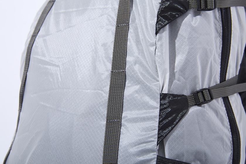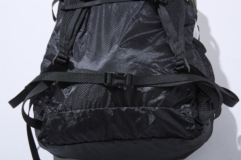 メッシュのポケットにボトルや折り畳み傘が収納できるサイド。さらに容量が調整できるコンプレッションベルトを搭載。荷物を詰めてもAラインの美しいフォルムをキープするとともに、収納物が少なくても横ブレを抑えてストレスなく使用できます。
