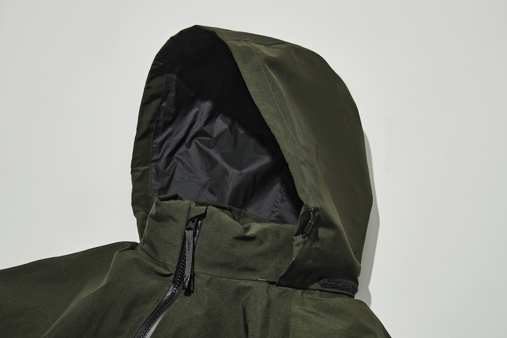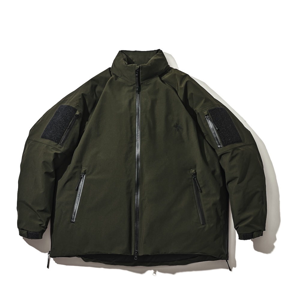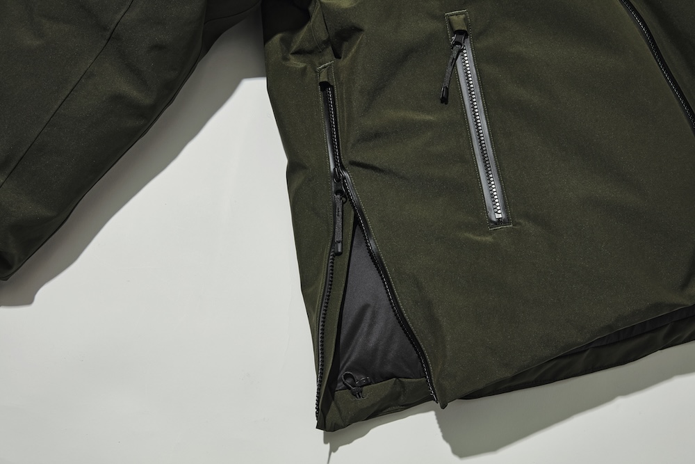 一方、GORE-TEX Three-Dimensional Down Jacketの表地には、防水耐久性、防風性、透湿性を備えるゴアテックス ファブリクスを採用。両腕にはジップポケットとベルクロパッチを備え、止水ジップを用いた。