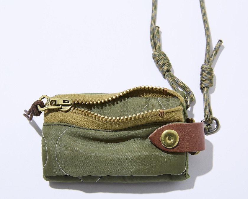 キルトステッチを施したタフな生地は、チャコ軍が80年代に採用したデッドストックのキルティングライナーパンツを解体したもの。ミリタリーウエア好き垂涎の洋服を使い、毎日のように使えるショルダーバッグとミニウォレットに再構築しています。