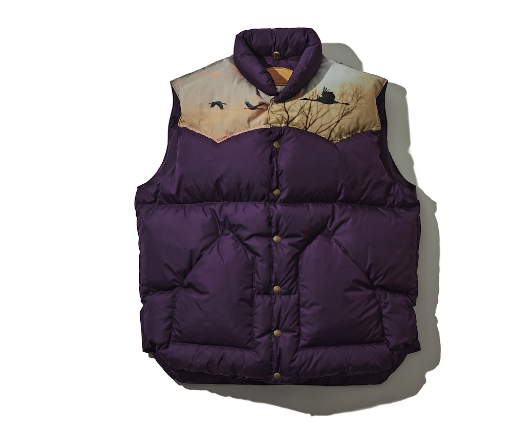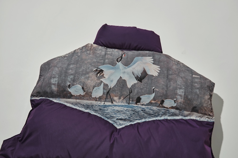 1970年代のヴィンテージダウンベストから着想し、夕景や雪景に舞う丹頂鶴のフォトプリントでアレンジ。写真はオリジナルではなく、あえて既存の画像素材を使用。70デニールのナイロンタフタ素材を表地と裏地に用いて、中綿には700FPヨーロッパ産の撥水ダウンを採用する。
